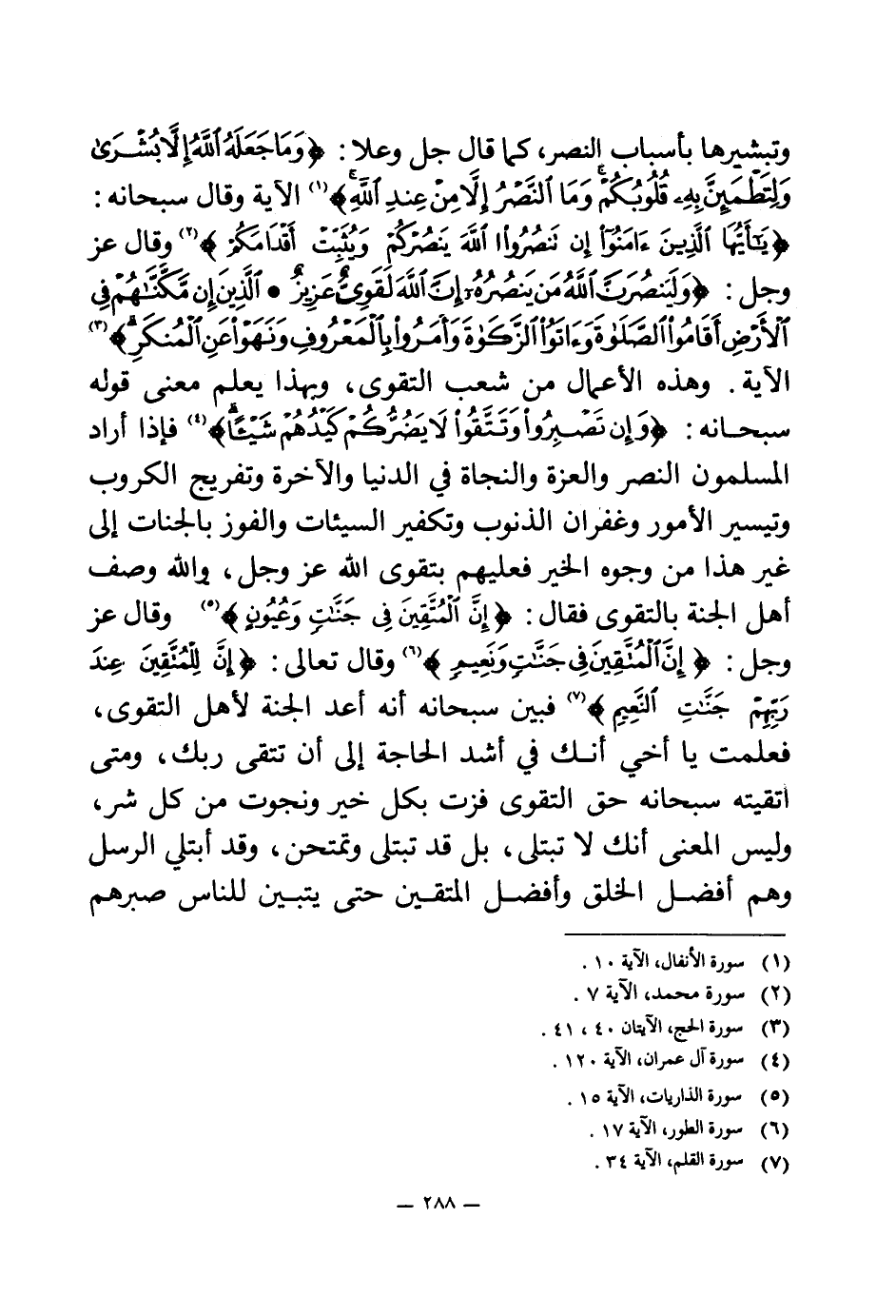 وتبشيرها بأسباب النصر، كما قال جل وعلا: {وَمَا جَعَلَهُ اللَّهُ إِلَّا بُشْرَى وَلِتَطْمَئِنَّ بِهِ قُلُوبُكُمْ وَمَا النَّصْرُ إِلَّا مِنْ عِنْدِ اللَّهِ} (¬1) الآية وقال سبحانه: {يَا أَيُّهَا الَّذِينَ آمَنُوا إِنْ تَنْصُرُوا اللَّهَ يَنْصُرْكُمْ وَيُثَبِّتْ أَقْدَامَكُمْ} (¬2) وقال عز وجل: {وَلَيَنْصُرَنَّ اللَّهُ مَنْ يَنْصُرُهُ إِنَّ اللَّهَ لَقَوِيٌّ عَزِيزٌ} (¬3) {الَّذِينَ إِنْ مَكَّنَّاهُمْ فِي الْأَرْضِ أَقَامُوا الصَّلَاةَ وَآتَوُا الزَّكَاةَ وَأَمَرُوا بِالْمَعْرُوفِ وَنَهَوْا عَنِ الْمُنْكَرِ} (¬4) الآية. وهذه الأعمال من شعب التقوى، وبهذا يعلم معنى قوله سبحانه: {وَإِنْ تَصْبِرُوا وَتَتَّقُوا لَا يَضُرُّكُمْ كَيْدُهُمْ شَيْئًا} (¬5) فإذا أراد المسلمون النصر والعزة والنجاة في الدنيا والآخرة وتفريج الكروب وتيسير الأمور وغفران الذنوب وتكفير السيئات والفوز بالجنات إلى غير هذا من وجوه الخير فعليهم بتقوى الله عز وجل، والله وصف أهل الجنة بالتقوى فقال: {إِنَّ الْمُتَّقِينَ فِي جَنَّاتٍ وَعُيُونٍ} (¬6) وقال عز وجل: {إِنَّ الْمُتَّقِينَ فِي جَنَّاتٍ وَنَعِيمٍ} (¬7) وقال تعالى: {إِنَّ لِلْمُتَّقِينَ عِنْدَ رَبِّهِمْ جَنَّاتِ النَّعِيمِ} (¬8) فبين سبحانه أنه أعد الجنة لأهل التقوى، فعلمت يا أخي أنك في أشد الحاجة إلى أن تتقي ربك، ومتى اتقيته سبحانه حق التقوى فزت بكل خير ونجوت من كل شر، وليس المعنى أنك لا تبتلى، بل قد تبتلى وتمتحن، وقد أبتلي الرسل وهم أفضل الخلق وأفضل المتقين؛ حتى يتبين للناس صبرهم