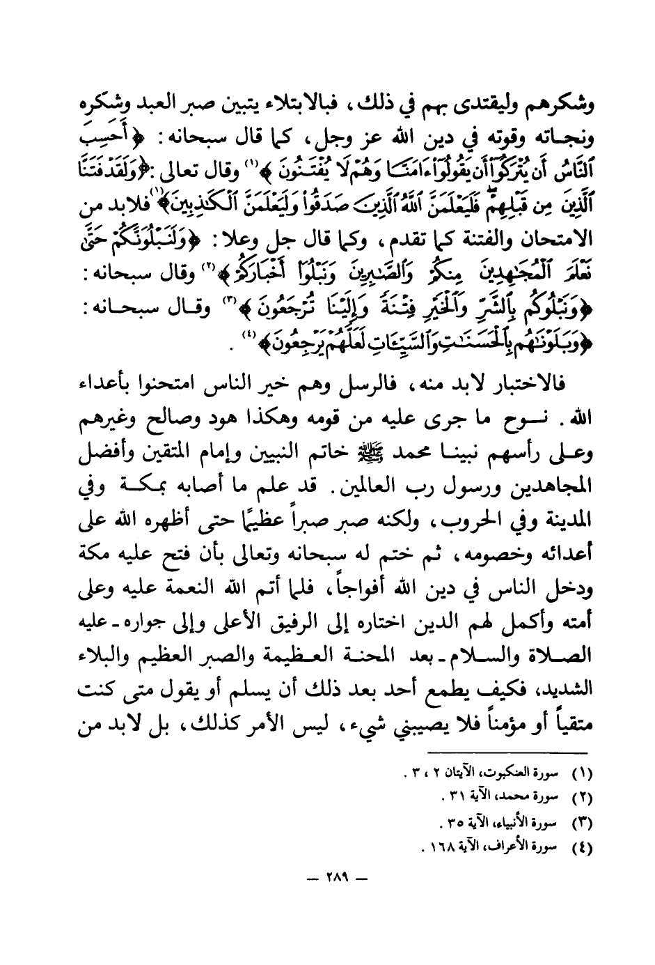 وشكرهم وليقتدى بهم في ذلك، فبالابتلاء يتبين صبر العبد وشكره ونجاته وقوته في دين الله عز وجل، كما قال سبحانه: {أَحَسِبَ النَّاسُ أَنْ يُتْرَكُوا أَنْ يَقُولُوا آمَنَّا وَهُمْ لَا يُفْتَنُونَ} (¬1) وقال تعالى: {وَلَقَدْ فَتَنَّا الَّذِينَ مِنْ قَبْلِهِمْ فَلَيَعْلَمَنَّ اللَّهُ الَّذِينَ صَدَقُوا وَلَيَعْلَمَنَّ الْكَاذِبِينَ} (¬2) فلا بد من الامتحان والفتنة كما تقدم، وكما قال جل وعلا: {وَلَنَبْلُوَنَّكُمْ حَتَّى نَعْلَمَ الْمُجَاهِدِينَ مِنْكُمْ وَالصَّابِرِينَ وَنَبْلُوَ أَخْبَارَكُمْ} (¬3) وقال سبحانه: {وَنَبْلُوكُمْ بِالشَّرِّ وَالْخَيْرِ فِتْنَةً وَإِلَيْنَا تُرْجَعُونَ} (¬4) وقال سبحانه: {وَبَلَوْنَاهُمْ بِالْحَسَنَاتِ وَالسَّيِّئَاتِ لَعَلَّهُمْ يَرْجِعُونَ} (¬5) فالاختبار لا بد منه، فالرسل وهم خير الناس امتحنوا بأعداء الله. نوح ما جرى عليه من قومه، وهكذا هود، وصالح، وغيرهم وعلى رأسهم نبينا محمد - صلى الله عليه وسلم - خاتم النبيين، وإمام المتقين، وأفضل المجاهدين، ورسول رب العالمين. قد علم ما أصابه بمكة، وفي المدينة وفي الحروب، ولكنه صبر صبرا عظيما حتى أظهره الله على أعدائه وخصومه، ثم ختم له سبحانه وتعالى بأن فتح عليه مكة ودخل الناس في دين الله أفواجا، فلما أتم الله النعمة عليه وعلى أمته وأكمل لهم الدين اختاره إلى الرفيق الأعلى وإلى جواره - عليه الصلاة والسلام- بعد المحنة العظيمة والصبر العظيم والبلاء الشديد، فكيف يطمع أحد بعد ذلك أن يسلم أو يقول متى كنت متقيا أو مؤمنا فلا يصيبني شيء، ليس الأمر كذلك بل لا بد من