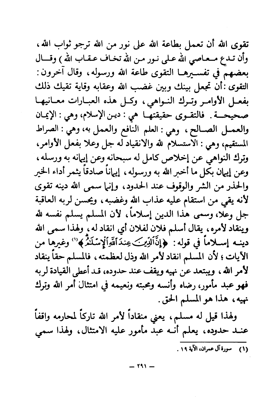تقوى الله أن تعمل بطاعة الله على نور من الله ترجو ثواب الله، وأن تدع معاصي الله على نور من الله تخاف عقاب الله) وقال بعضهم في تفسيرها التقوى طاعة الله ورسوله، وقال آخرون: التقوى: أن تجعل بينك وبين غضب الله وعقابه وقاية تقيك ذلك بفعل الأوامر وترك النواهي، وكل هذه العبارات معانيها صحيحة. فالتقوى حقيقتها هي: دين الإسلام، وهي: الإيمان والعمل الصالح، وهي: العلم النافع والعمل به، وهي: الصراط المستقيم، وهي: الاستسلام لله والانقياد له جل وعلا بفعل الأوامر، وترك النواهي عن إخلاص كامل له سبحانه، وعن إيمانه به ورسله، وعن إيمان بكل ما أخبر الله به ورسوله، إيمانا صادقا يثمر أداء الخير والحذر من الشر والوقوف عند الحدود، وإنما سمى الله دينه تقوى لأنه يقي من استقام عليه عذاب الله وغضبه، ويحسن لربه العاقبة جل وعلا، وسمى هذا الدين إسلاما، لأن المسلم يسلم نفسه لله وينقاد لأمره، يقال أسلم فلان لفلان أي انقاد له، ولهذا سمى الله دينه إسلاما في قوله: {إِنَّ الدِّينَ عِنْدَ اللَّهِ الْإِسْلَامُ} (¬1) وغيرها من الآيات، لأن المسلم انقاد لأمر الله وذل لعظمته، فالمسلم حقا ينقاد لأمر الله، ويبتعد عن نهيه ويقف عند حدوده، قد أعطى القيادة لربه فهو عبد مأمور، رضاه وأنسه ومحبته ونعيمه في امتثال أمر الله وترك نهيه، هذا هو المسلم الحق.