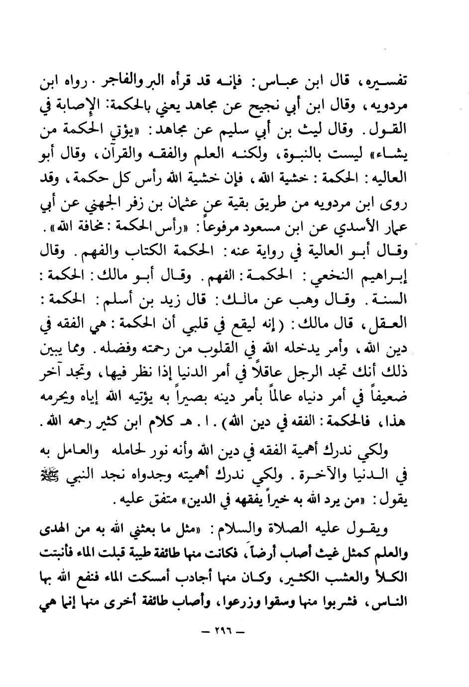 تفسيره، قال ابن عباس: فإنه قد قرأه البر والفاجر. رواه ابن مردويه، وقال ابن أبي نجيح عن مجاهد يعني بالحكمة: الإصابة في القول. وقال ليث بن أبي سليم عن مجاهد: {يُؤْتِي الْحِكْمَةَ مَنْ يَشَاءُ} (¬1) ليست بالنبوة، ولكنه العلم والفقه والقرآن، وقال أبو العاليه: الحكمة: خشية الله، فإن خشية الله رأس كل حكمة، وقد روى ابن مردويه من طريق بقية عن عثمان بن زفر الجهني عن أبي عمار الأسدي عن ابن مسعود مرفوعا: رأس الحكمة مخافة الله. وقال أبو العالية في رواية عنه: الحكمة الكتاب والفهم. وقال إبراهيم النخعي: الحكمة: الفهم. وقال أبو مالك: الحكمة: السنة. وقال وهب عن مالك: قال زيد بن أسلم: الحكمة: العقل، قال مالك: (إنه ليقع في قلبي أن الحكمة: هي الفقه في دين الله، وأمر يدخله الله في القلوب من رحمته وفضله. ومما يبين ذلك أنك تجد الرجل عاقلا في أمر الدنيا إذا نظر فيها، وتجد آخر ضعيفا في أمر دنياه عالما بأمر دينه بصيرا به يؤتيه الله إياه ويحرمه هذا، فالحكمة: الفقه في دين الله) . ا. هـ كلام ابن كثير رحمه الله.