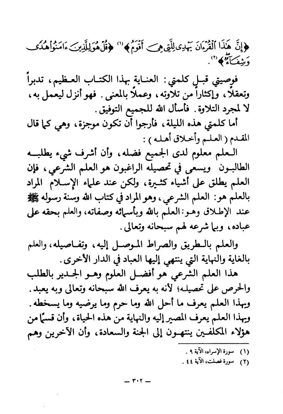 العلم معلوم لدى الجميع فضله، وأن أشرف شيء يطلبه الطالبون ويسعى في تحصيله الراغبون هو العلم الشرعي، فإن العلم يطلق على أشياء كثيرة، ولكن عند علماء الإسلام المراد بالعلم هو: العلم الشرعي، وهو المراد في كتاب الله وسنة رسوله - صلى الله عليه وسلم - عند الإطلاق وهو: العلم بالله وبأسمائه وصفاته، والعلم بحقه على عباده، وبما شرعه لهم سبحانه وتعالى.