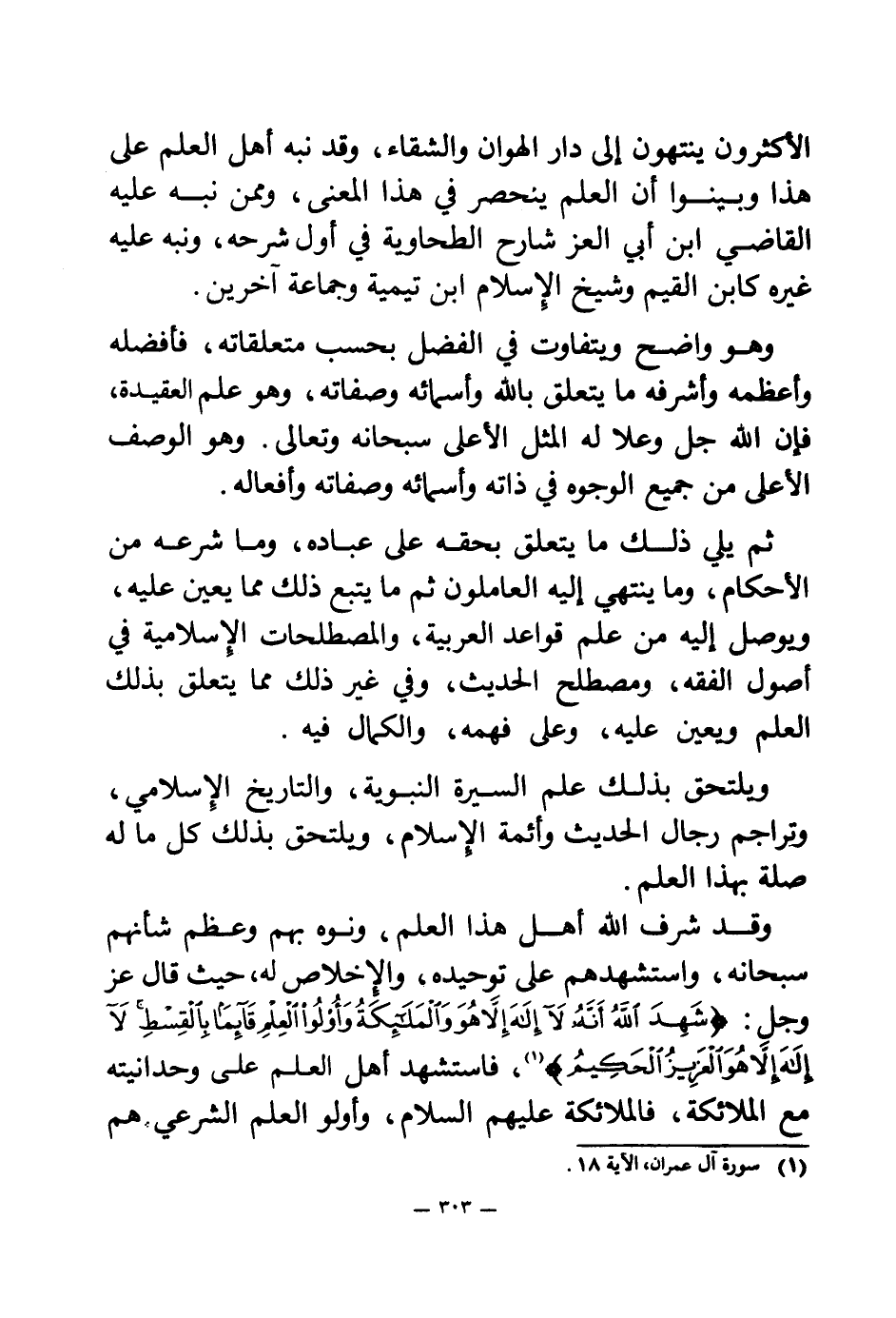 وقد شرف الله أهل هذا العلم، ونوه بهم وعظم شأنهم سبحانه، واستشهدهم على توحيده، والإخلاص له، حيث قال عز وجل: {شَهِدَ اللَّهُ أَنَّهُ لَا إِلَهَ إِلَّا هُوَ وَالْمَلَائِكَةُ وَأُولُو الْعِلْمِ قَائِمًا بِالْقِسْطِ لَا إِلَهَ إِلَّا هُوَ الْعَزِيزُ الْحَكِيمُ} (¬1) فاستشهد أهل العلم على وحدانيته مع الملائكة، فالملائكة - عليهم السلام -، وأولو العلم الشرعي هم
