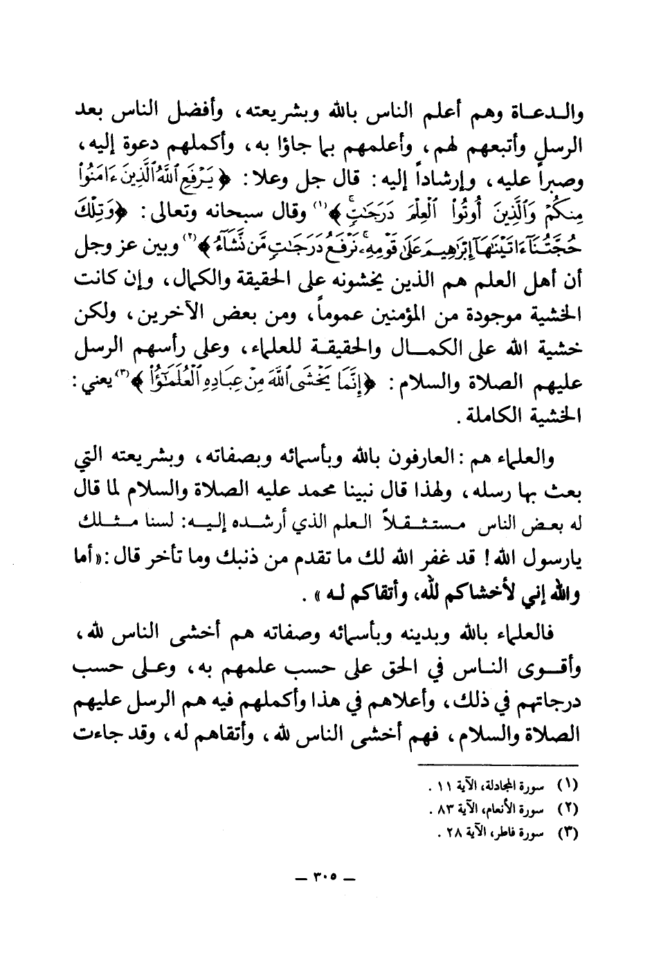والدعاة وهم أعلم الناس بالله وبشريعته، وأفضل الناس بعد الرسل وأتبعهم لهم، وأعلمهم بما جاؤا به، وأكملهم دعوة إليه، وصبرا عليه، وإرشادا إليه: قال جل وعلا: {يَرْفَعِ اللَّهُ الَّذِينَ آمَنُوا مِنْكُمْ وَالَّذِينَ أُوتُوا الْعِلْمَ دَرَجَاتٍ} (¬1) وقال سبحانه وتعالى {وَتِلْكَ حُجَّتُنَا آتَيْنَاهَا إِبْرَاهِيمَ عَلَى قَوْمِهِ نَرْفَعُ دَرَجَاتٍ مَنْ نَشَاءُ} (¬2) وبين عز وجل أن أهل العلم هم الذين يخشونه على الحقيقة والكمال، وإن كانت الخشية موجودة من المؤمنين عموما، ومن بعض الآخرين، ولكن خشية الله على الكمال والحقيقة للعلماء، وعلى رأسهم الرسل - عليهم الصلاة والسلام -: {إِنَّمَا يَخْشَى اللَّهَ مِنْ عِبَادِهِ الْعُلَمَاءُ} (¬3) يعني: الخشية الكاملة.