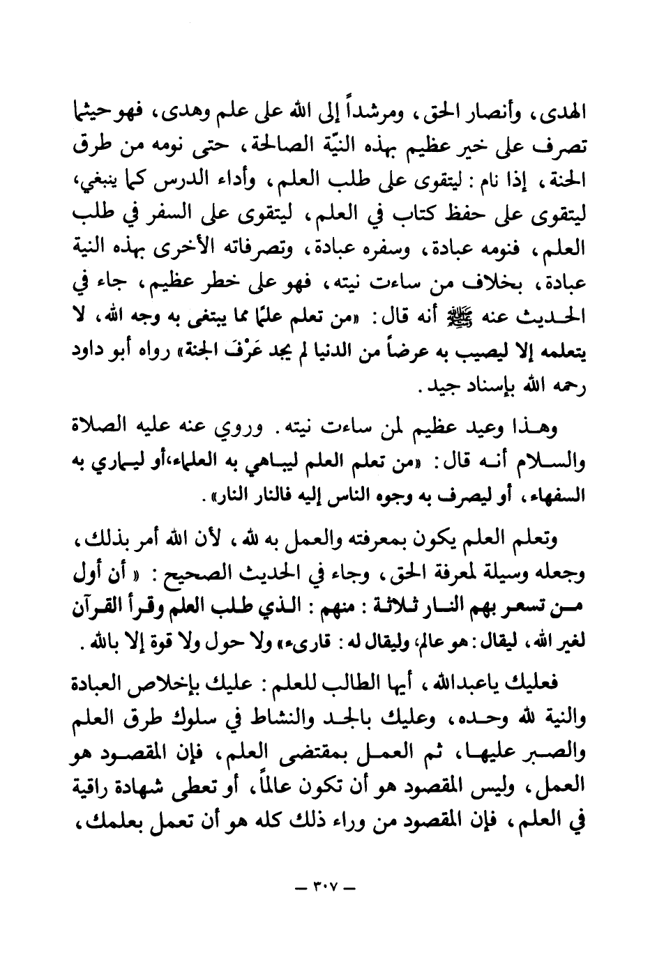 الهدى، وأنصار الحق، ومرشدا إلى الله على علم وهدى، فهو حيثما تصرف على خير عظيم بهذه النية الصالحة، حتى نومه من طرق الجنة، إذا نام: ليتقوى على طلب العلم، وأداء الدرس كما ينبغي، ليتقوى على حفظ كتاب في العلم، ليتقوى على السفر في طلب العلم، فنومه عبادة، وسفره عبادة، وتصرفاته الأخرى بهذه النية عبادة، بخلاف من ساءت نيته، فهو على خطر عظيم، جاء في الحديث عنه - صلى الله عليه وسلم - أنه قال: «من تعلم علما مما يبتغى به وجه الله، لا يتعلمه إلا ليصيب به عرضا من الدنيا لم يجد عرف الجنة (¬1) » رواه أبو داود - رحمه الله - بإسناد جيد.