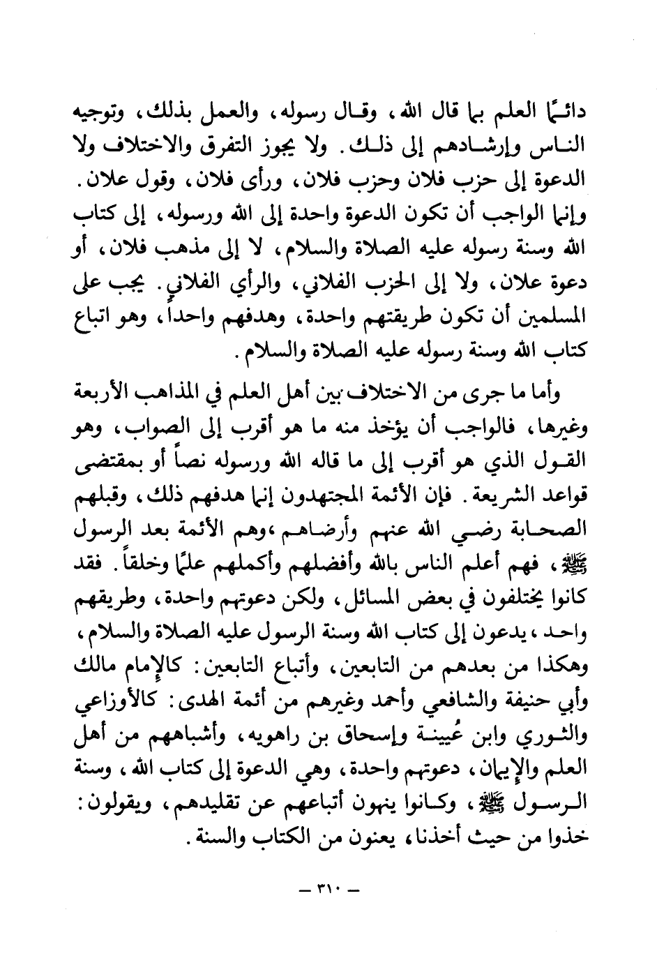 فقد كانوا يختلفون في بعض المسائل، ولكن دعوتهم واحدة، وطريقهم واحد، يدعون إلى كتاب الله وسنة الرسول - عليه الصلاة والسلام -، وهكذا من بعدهم من التابعين، وأتباع التابعين: كالإمام مالك وأبي حنيفة والشافعي وأحمد وغيرهم من أئمة الهدى: كالأوزاعي والثوري وابن عيينة وإسحاق بن راهويه، وأشباههم من أهل العلم والإيمان، دعوتهم واحدة، وهي الدعوة إلى كتاب الله، وسنة الرسول - صلى الله عليه وسلم -، وكانوا ينهون أتباعهم عن تقليدهم، ويقولون: خذوا من حيث أخذنا، يعنون من الكتاب والسنة.