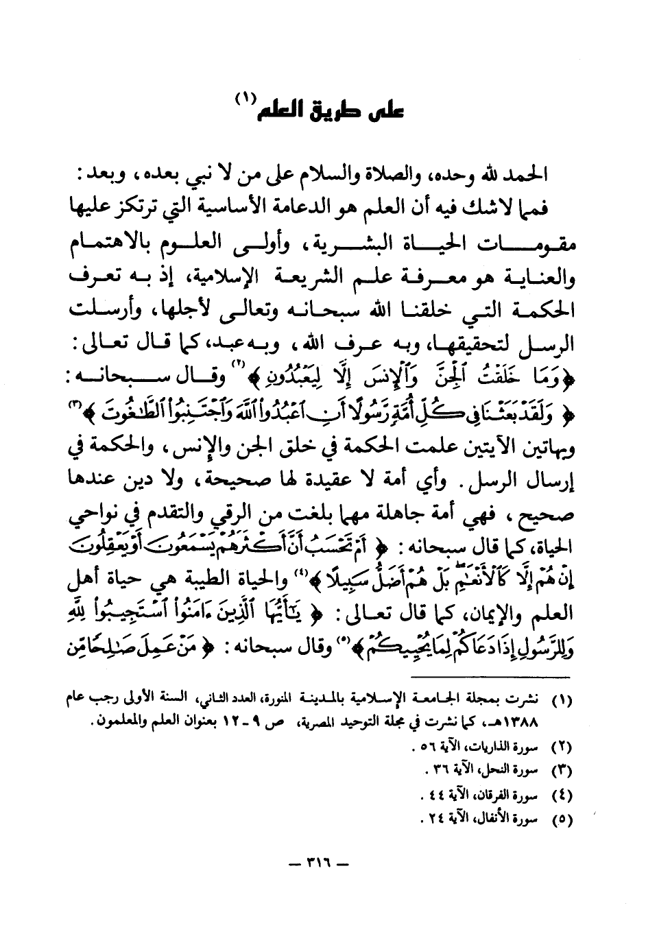 فمما لا شك فيه أن العلم هو الدعامة الأساسية التي ترتكز عليها مقومات الحياة البشرية، وأولى العلوم بالاهتمام والعناية هو معرفة علم الشريعة الإسلامية، إذ به تعرف الحكمة التي خلقنا الله سبحانه وتعالى لأجلها، وأرسلت الرسل لتحقيقها، وبه عرف الله، وبه عبد، كما قال تعالى: {وَمَا خَلَقْتُ الْجِنَّ وَالْإِنْسَ إِلَّا لِيَعْبُدُونِ} (¬1) وقال سبحانه: {وَلَقَدْ بَعَثْنَا فِي كُلِّ أُمَّةٍ رَسُولًا أَنِ اُعْبُدُوا اللَّهَ وَاجْتَنِبُوا الطَّاغُوتَ} (¬2) وبهاتين الآيتين علمت الحكمة في خلق الجن والإنس، والحكمة في إرسال الرسل. وأي أمة لا عقيدة لها صحيحة، ولا دين عندها صحيح، فهي أمة جاهلة مهما بلغت من الرقي والتقدم في نواحي الحياة، كما قال سبحانه: {أَمْ تَحْسَبُ أَنَّ أَكْثَرَهُمْ يَسْمَعُونَ أَوْ يَعْقِلُونَ إِنْ هُمْ إِلَّا كَالْأَنْعَامِ بَلْ هُمْ أَضَلُّ سَبِيلًا} (¬3) والحياة الطيبة هي حياة أهل العلم والإيمان، كما قال تعالى: {يَا أَيُّهَا الَّذِينَ آمَنُوا اسْتَجِيبُوا لِلَّهِ وَلِلرَّسُولِ إِذَا دَعَاكُمْ لِمَا يُحْيِيكُمْ} (¬4) وقال سبحانه: