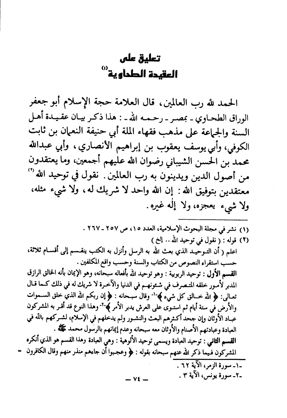 الحمد لله رب العالمين، قال العلامة حجة الإسلام أبو جعفر الوراق الطحاوي - بمصر - رحمه الله -: هذا ذكر بيان عقيدة أهل السنة والجماعة على مذهب فقهاء الملة أبي حنيفة النعمان بن ثابت الكوفي، وأبي يوسف يعقوب بن إبراهيم الأنصاري، وأبي عبد الله محمد بن الحسن الشيباني رضوان الله عليهم أجمعين، وما يعتقدون من أصول الدين ويدينون به رب العالمين. نقول في توحيد الله
