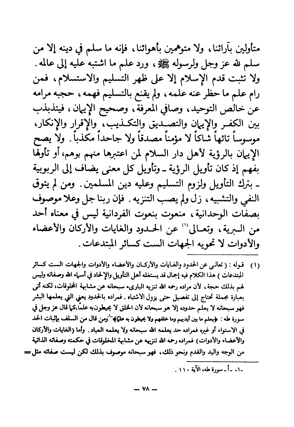 ولا يصح الإيمان بالرؤية لأهل دار السلام لمن اعتبرها منهم بوهم، أو تأولها بفهم إذ كان تأويل الرؤية - وتأويل كل معنى يضاف إلى الربوبية - بترك التأويل ولزوم التسليم وعليه دين المسلمين. ومن لم يتوق النفي والتشبيه، زل ولم يصب التنزيه. فإن ربنا جل وعلا موصوف بصفات الوحدانية، منعوت بنعوت الفردانية ليس في معناه أحد من البرية، وتعالى. عن الحدود والغايات والأركان والأعضاء والأدوات لا تحويه الجهات الست كسائر المبتدعات.