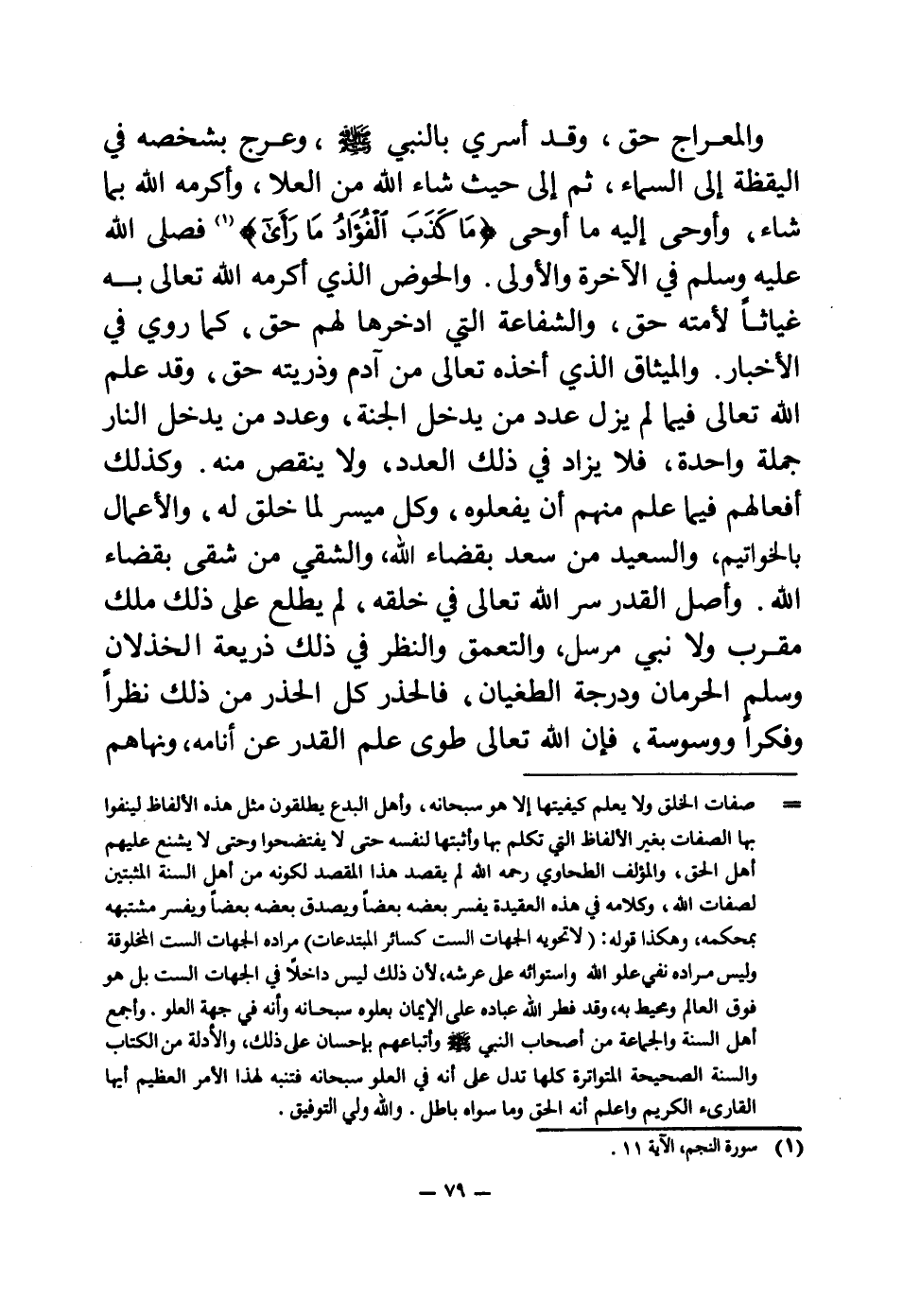 والمعراج حق، وقد أسري بالنبي صلى الله عليه وسلم، وعرج بشخصه في اليقظة إلى السماء، ثم إلى حيث شاء الله من العلا، وأكرمه الله بما شاء، وأوحى إليه ما أوحى {مَا كَذَبَ الْفُؤَادُ مَا رَأَى} (¬1) فصلى الله عليه وسلم في الآخرة والأولى. والحوض الذي أكرمه الله تعالى به غياثا لأمته حق، والشفاعة التي ادخرها لهم حق، كما روي في الأخبار.