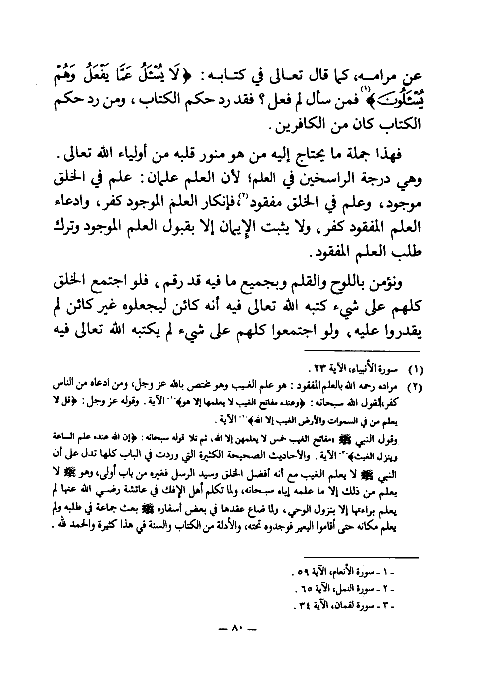 عن مرامه، كما قال تعالى في كتابه: {لَا يُسْأَلُ عَمَّا يَفْعَلُ وَهُمْ يُسْأَلُونَ} (¬1) فمن سأل لم فعل؟ فقد رد حكم الكتاب، ومن رد حكم الكتاب كان من الكافرين. فهذا جملة ما يحتاج إليه من هو منور قلبه من أولياء الله تعالى. وهي درجة الراسخين في العلم؛ لأن العلم علمان: علم في الخلق موجود، وعلم في الخلق مفقود، فإنكار العلم الموجود كفر، وادعاء العلم المفقود كفر، ولا يثبت الإيمان إلا بقبول العلم الموجود وترك طلب العلم المفقود.
