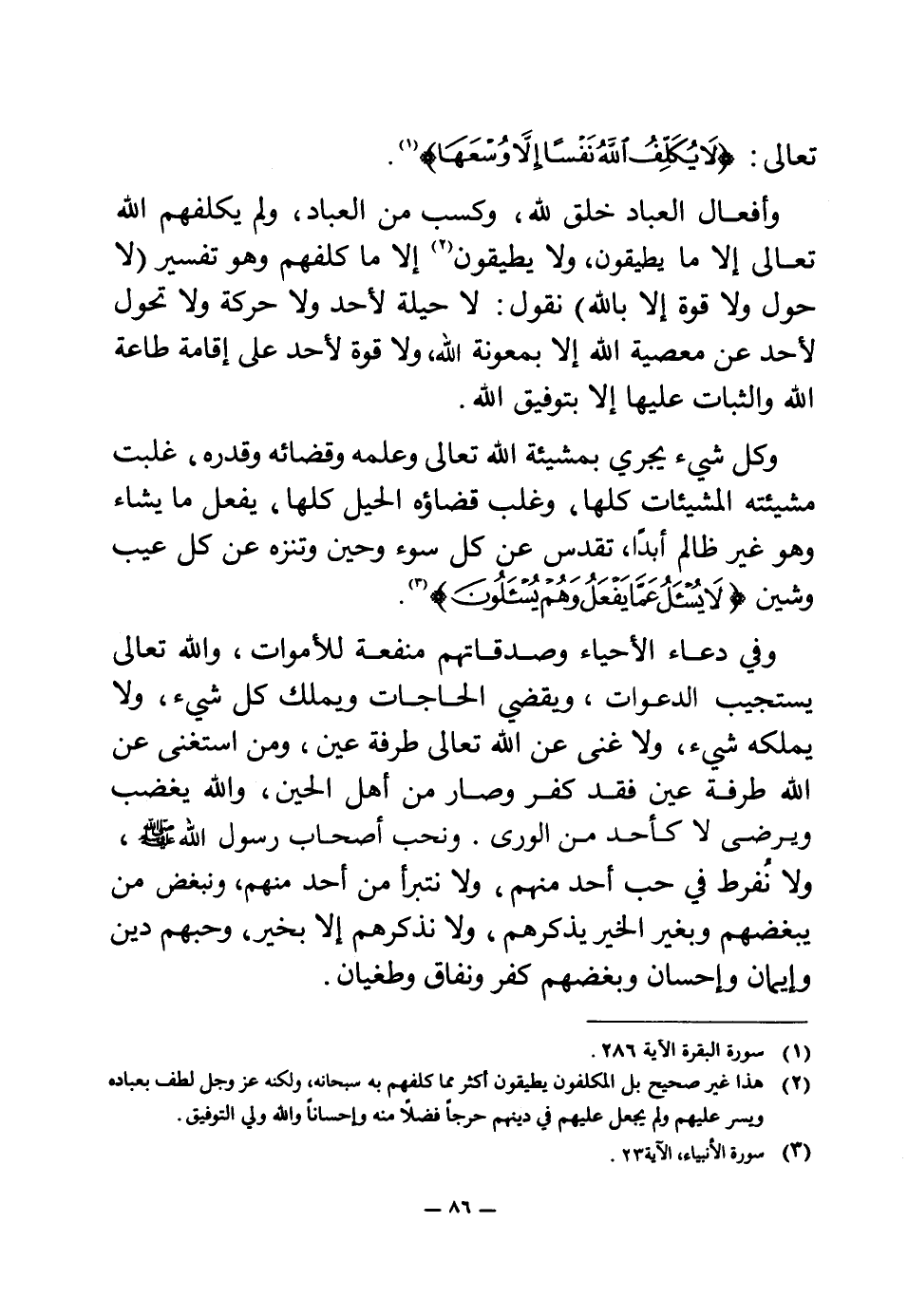وأفعال العباد خلق لله، وكسب من العباد، ولم يكلفهم الله تعالى إلا ما يطيقون، ولا يطيقون