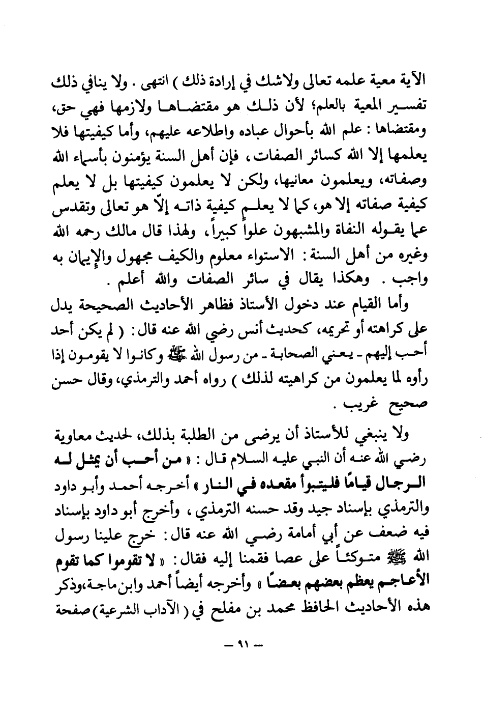 وأما القيام عند دخول الأستاذ فظاهر الأحاديث الصحيحة يدل على كراهته أو تحريمه، كحديث أنس رضي الله عنه قال: «لم يكن أحد أحب إليهم - يعني الصحابة - من رسول الله صلى الله عليه وسلم وكانوا لا يقومون إذا رأوه لما يعلمون من كراهيته لذلك (¬1) » رواه أحمد والترمذي، وقال حسن صحيح غريب.