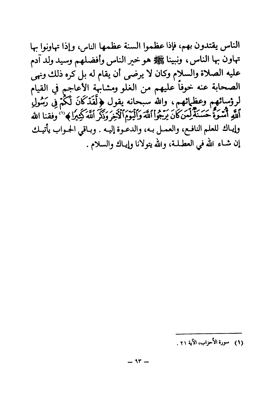 الناس يقتدون بهم، فإذا عظموا السنة عظمها الناس، وإذا تهاونوا بها تهاون بها الناس، ونبينا صلى الله عليه وسلم هو خير الناس وأفضلهم وسيد ولد آدم عليه الصلاة والسلام وكان لا يرضى أن يقام له بل كره ذلك ونهى الصحابة عنه خوفا عليهم من الغلو ومشابهة الأعاجم في القيام لرؤسائهم وعظمائهم، والله سبحانه يقول {لَقَدْ كَانَ لَكُمْ فِي رَسُولِ اللَّهِ أُسْوَةٌ حَسَنَةٌ لِمَنْ كَانَ يَرْجُو اللَّهَ وَالْيَوْمَ الْآخِرَ وَذَكَرَ اللَّهَ كَثِيرًا} (¬1) وفقنا الله وإياك للعلم النافع، والعمل به، والدعوة إليه. وباقي الجواب يأتيك إن شاء الله في العطلة، والله يتولانا وإياك والسلام.