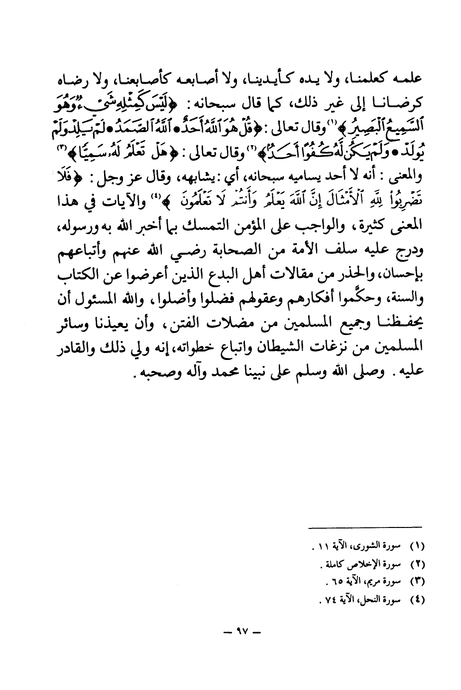 علمه كعلمنا، ولا يده كأيدينا، ولا أصابعه كأصابعنا، ولا رضاه كرضانا إلى غير ذلك، كما قال سبحانه: {لَيْسَ كَمِثْلِهِ شَيْءٌ وَهُوَ السَّمِيعُ الْبَصِيرُ} (¬1) وقال تعالى: {قُلْ هُوَ اللَّهُ أَحَدٌ} (¬2) {اللَّهُ الصَّمَدُ} (¬3) {لَمْ يَلِدْ وَلَمْ يُولَدْ} (¬4) {وَلَمْ يَكُنْ لَهُ كُفُوًا أَحَدٌ} (¬5) وقال تعالى: {هَلْ تَعْلَمُ لَهُ سَمِيًّا} (¬6) والمعنى: أنه لا أحد يساميه سبحانه، أي: يشابهه، وقال عز وجل: {فَلَا تَضْرِبُوا لِلَّهِ الْأَمْثَالَ إِنَّ اللَّهَ يَعْلَمُ وَأَنْتُمْ لَا تَعْلَمُونَ} (¬7) والآيات في هذا المعنى كثيرة، والواجب على المؤمن التمسك بما أخبر الله به ورسوله، ودرج عليه سلف الأمة من الصحابة رضي الله عنهم وأتباعهم بإحسان، والحذر من مقالات أهل البدع الذين أعرضوا عن الكتاب والسنة، وحكموا أفكارهم وعقولهم فضلوا وأضلوا، والله المسئول أن يحفظنا وجميع المسلمين من مضلات الفتن، وأن يعيذنا وسائر المسلمين من نزغات الشيطان واتباع خطواته، إنه ولي ذلك والقادر عليه. وصلى الله وسلم على نبينا محمد وآله وصحبه.