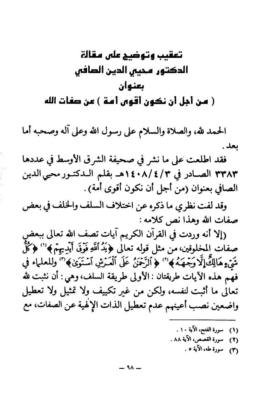 فقد اطلعت على ما نشر في صحيفة الشرق الأوسط في عددها 3383 الصادر في 3 \4\1408 هـ بقلم الدكتور محيي الدين الصافي بعنوان (من أجل أن نكون أقوى أمة) . وقد لفت نظري ما ذكره عن اختلاف السلف والخلف في بعض صفات الله وهذا نص كلامه: