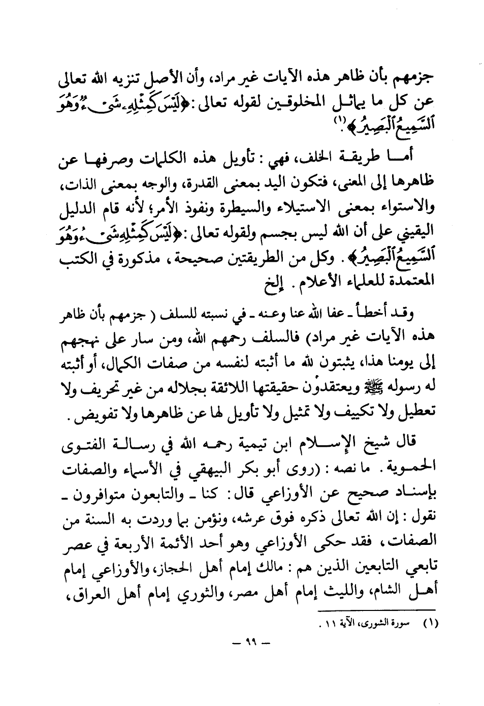 أما طريقة الخلف، فهي: تأويل هذه الكلمات وصرفها عن ظاهرها إلى المعنى، فتكون اليد بمعنى القدرة، والوجه بمعنى الذات، والاستواء بمعنى الاستيلاء والسيطرة ونفوذ الأمر؛ لأنه قام الدليل اليقيني على أن الله ليس بجسم ولقوله تعالى: {لَيْسَ كَمِثْلِهِ شَيْءٌ وَهُوَ السَّمِيعُ الْبَصِيرُ} (¬2) وكل من الطريقتين صحيحة، مذكورة في الكتب المعتمدة للعلماء الأعلام. إلخ.