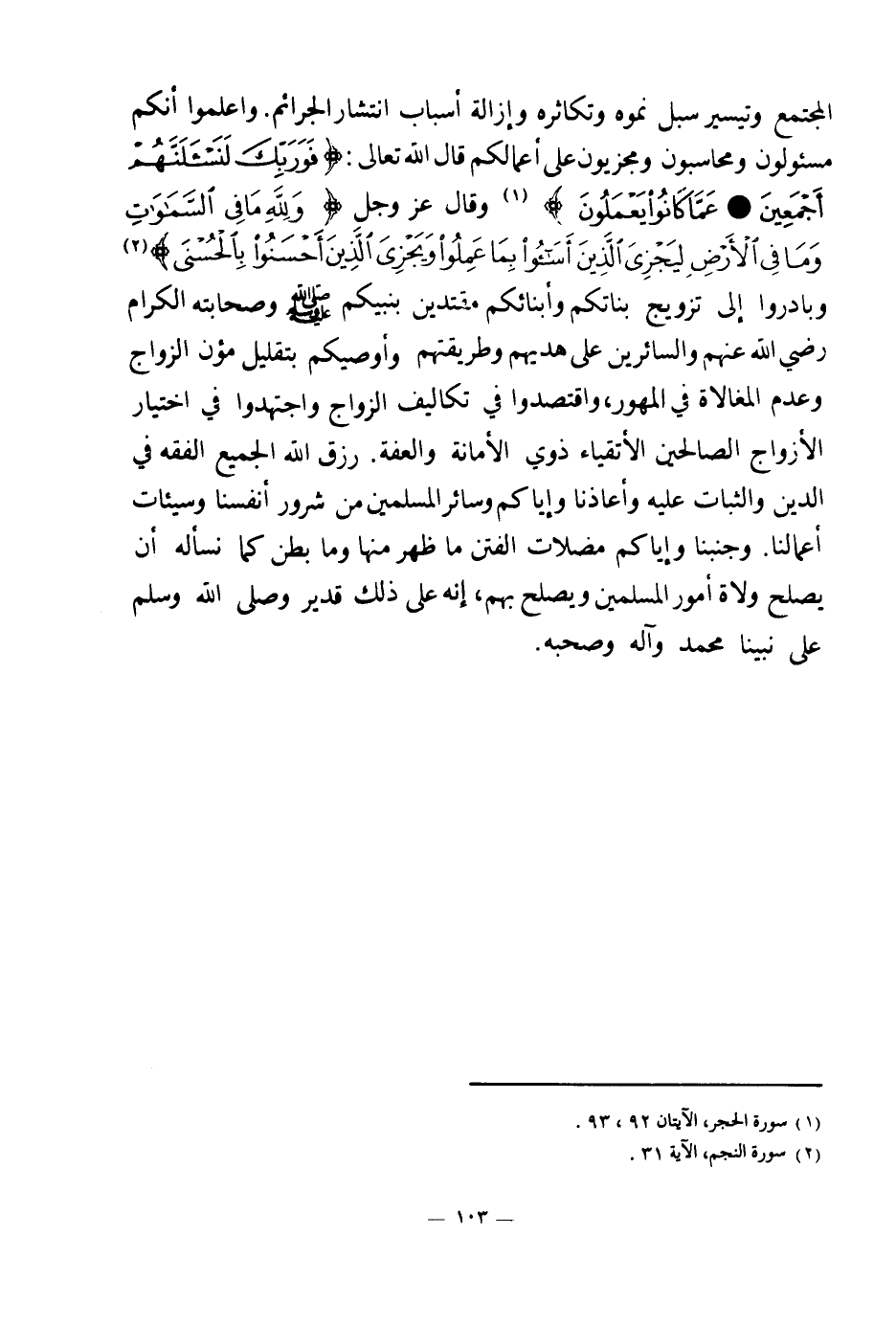 المجتمع وتيسير سبل نموه وتكاثره وإزالة أسباب انتشار الجرائم. واعلموا أنكم مسئولون ومحاسبون ومجزيون على أعمالكم قال الله تعالى: {فَوَرَبِّكَ لَنَسْأَلَنَّهُمْ أَجْمَعِينَ} (¬1) {عَمَّا كَانُوا يَعْمَلُونَ} (¬2) وقال عز وجل: {وَلِلَّهِ مَا فِي السَّمَاوَاتِ وَمَا فِي الْأَرْضِ لِيَجْزِيَ الَّذِينَ أَسَاءُوا بِمَا عَمِلُوا وَيَجْزِيَ الَّذِينَ أَحْسَنُوا بِالْحُسْنَى} (¬3) وبادروا إلى تزويج بناتكم وأبنائكم مقتدين بنبيكم صلى الله عليه وسلم وصحابته الكرام رضي الله عنهم والسائرين على هديهم وطريقتهم، وأوصيكم بتقليل مؤن الزواج وعدم المغالاة في المهور، واقتصدوا في تكاليف الزواج واجتهدوا في اختيار الأزواج الصالحين الأتقياء ذوي الأمانة والعفة.