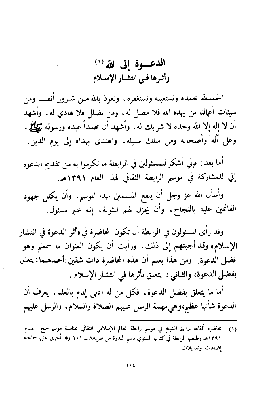 أما بعد: فإني أشكر للمسئولين في الرابطة ما تكرموا به من تقديم الدعوة إلي للمشاركة في موسم الرابطة الثقافي لهذا العام 1391 هـ.