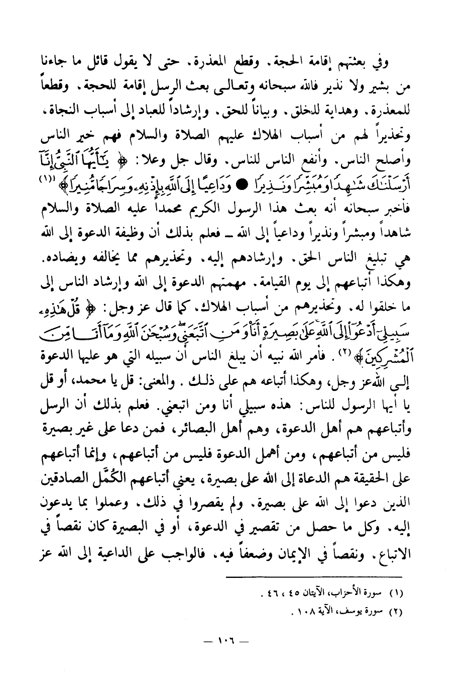 وفي بعثهم إقامة الحجة، وقطع المعذرة، حتى لا يقول قائل ما جاءنا من بشير ولا نذير، فالله سبحانه وتعالى بعث الرسل إقامة للحجة، وقطعا للمعذرة، وهداية للخلق، وبيانا للحق، وإرشادا للعباد إلى أسباب النجاة، وتحذيرا لهم من أسباب الهلاك عليهم الصلاة والسلام فهم خير الناس وأصلح الناس، وأنفع الناس للناس، وقال جل وعلا: {يَا أَيُّهَا النَّبِيُّ إِنَّا أَرْسَلْنَاكَ شَاهِدًا وَمُبَشِّرًا وَنَذِيرًا} (¬1) {وَدَاعِيًا إِلَى اللَّهِ بِإِذْنِهِ وَسِرَاجًا مُنِيرًا} (¬2) فأخبر سبحانه أنه بعث هذا الرسول الكريم محمدا عليه الصلاة والسلام شاهدا ومبشرا ونذيرا وداعيا إلى الله - فعلم بذلك أن وظيفة الدعوة إلى الله هي تبليغ الناس الحق، وإرشادهم إليه، وتحذيرهم مما يخالفه ويضاده. وهكذا أتباعهم إلى يوم القيامة. مهمتهم الدعوة إلى الله وإرشاد الناس إلى ما خلقوا له، وتحذيرهم من أسباب الهلاك، كما قال عز وجل: {قُلْ هَذِهِ سَبِيلِي أَدْعُو إِلَى اللَّهِ عَلَى بَصِيرَةٍ أَنَا وَمَنِ اتَّبَعَنِي وَسُبْحَانَ اللَّهِ وَمَا أَنَا مِنَ الْمُشْرِكِينَ} (¬3) فأمر الله نبيه أن يبلغ الناس أن سبيله التي هو عليها الدعوة إلى الله عز وجل، وهكذا أتباعه هم على ذلك. والمعنى قل يا محمد، أو قل يا أيها الرسول للناس: هذه سبيلي أنا ومن اتبعني. فعلم بذلك أن الرسل وأتباعهم هم أهل الدعوة، وهم أهل البصائر، فمن دعا على غير بصيرة فليس من أتباعهم، ومن أهمل الدعوة فليس من أتباعهم، وإنما أتباعهم على الحقيقة هم الدعاة إلى الله على بصيرة، يعني أتباعهم الكمل الصادقين الذين دعوا إلى الله على بصيرة، ولم يقصروا في ذلك، وعملوا بما يدعون إليه، وكل ما حصل من تقصير في الدعوة، أو في البصيرة كان نقصا في الاتباع، ونقصا في الإيمان وضعفا فيه، فالواجب على الداعية إلى الله عز