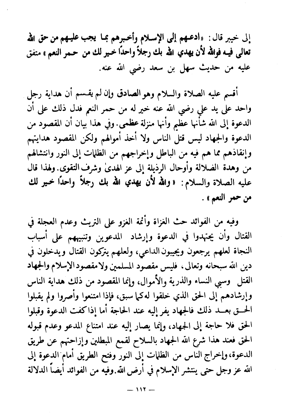 أقسم عليه الصلاة والسلام وهو الصادق، وإن لم يقسم، أن هداية رجل واحد على يد علي رضي الله عنه خير له من حمر النعم فدل ذلك على أن الدعوة إلى الله شأنها عظيم وأنها منزلة عظمى. وفي هذا بيان أن المقصود من الدعوة والجهاد ليس قتل الناس ولا أخذ أموالهم ولكن المقصود هدايتهم وإنقاذهم مما هم فيه من الباطل وإخراجهم من الظلمات إلى النور وانتشالهم من وهدة الضلالة وأوحال الرذيلة إلى عز الهدى وشرف التقوى. ولهذا قال عليه الصلاة والسلام: «والله لأن يهدي الله بك رجلا واحدا خير لك من حمر النعم (¬2) » .