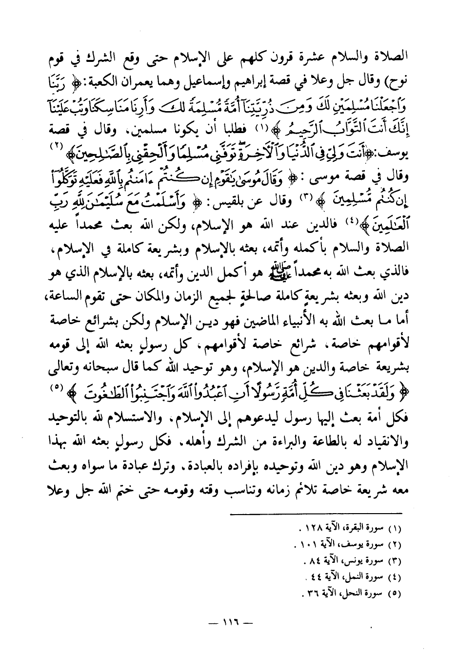 الصلاة والسلام عشرة قرون كلهم على الإسلام حتى وقع الشرك في قوم نوح» وقال جل وعلا في قصة إبراهيم وإسماعيل وهما يعمران الكعبة: {رَبَّنَا وَاجْعَلْنَا مُسْلِمَيْنِ لَكَ وَمِنْ ذُرِّيَّتِنَا أُمَّةً مُسْلِمَةً لَكَ وَأَرِنَا مَنَاسِكَنَا وَتُبْ عَلَيْنَا إِنَّكَ أَنْتَ التَّوَّابُ الرَّحِيمُ} (¬1) فطلبا أن يكونا مسلمين، وقال في قصة يوسف: {أَنْتَ وَلِيِّي فِي الدُّنْيَا وَالْآخِرَةِ تَوَفَّنِي مُسْلِمًا وَأَلْحِقْنِي بِالصَّالِحِينَ} (¬2) وقال في قصة موسى: {وَقَالَ مُوسَى يَا قَوْمِ إِنْ كُنْتُمْ آمَنْتُمْ بِاللَّهِ فَعَلَيْهِ تَوَكَّلُوا إِنْ كُنْتُمْ مُسْلِمِينَ} (¬3) وقال عن بلقيس: {وَأَسْلَمْتُ مَعَ سُلَيْمَانَ لِلَّهِ رَبِّ الْعَالَمِينَ} (¬4) فالدين عند الله هو الإسلام، ولكن الله بعث محمدا عليه الصلاة والسلام بأكمله وأتمه، بعثه بالإسلام وبشريعة كاملة في الإسلام، فالذي بعث الله به محمدا صلى الله عليه وسلم هو أكمل الدين وأتمه، بعثه بالإسلام الذي هو دين الله وبعثه بشريعة كاملة صالحة لجميع الزمان والمكان حتى تقوم الساعة، أما ما بعث الله به الأنبياء الماضين فهو دين الإسلام ولكن بشرائع خاصة لأقوامهم خاصة، شرائع خاصة لأقوامهم، كل رسول بعثه الله إلى قومه بشريعة خاصة والدين هو الإسلام، وهو توحيد الله كما قال سبحانه وتعالى {وَلَقَدْ بَعَثْنَا فِي كُلِّ أُمَّةٍ رَسُولًا أَنِ اُعْبُدُوا اللَّهَ وَاجْتَنِبُوا الطَّاغُوتَ} (¬5) فكل أمة بعث إليها رسول ليدعوهم إلى الإسلام، والاستسلام لله بالتوحيد والانقياد له بالطاعة والبراءة من الشرك وأهله، فكل رسول بعثه الله بهذا الإسلام وهو دين الله وتوحيده بإفراده بالعبادة، وترك عبادة ما سواه وبعث معه شريعة خاصة تلائم زمانه وتناسب وقته وقومه حتى ختم الله جل وعلا