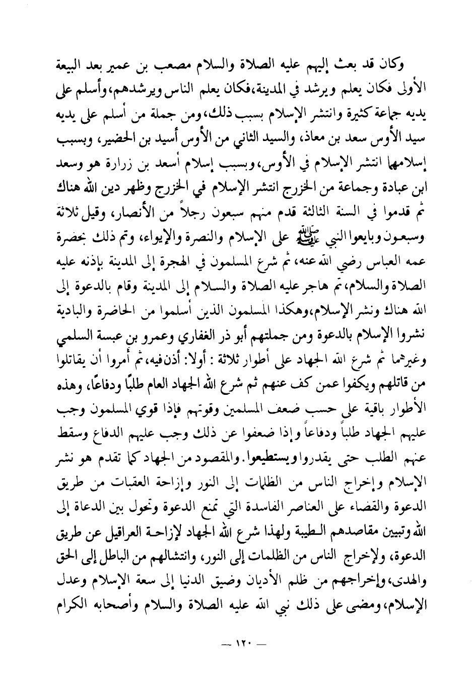 وكان قد بعث إليهم عليه الصلاة والسلام مصعب بن عمير بعد البيعة الأولى فكان يعلم ويرشد في المدينة، فكان يعلم الناس ويرشدهم وأسلم على يديه جماعة كثيرة وانتشر الإسلام بسبب ذلك، ومن جملة من أسلم على يديه سيد الأوس سعد بن معاذ، والسيد الثاني من الأوس أسيد بن الحضير، وبسبب إسلامهما انتشر الإسلام في الأوس، وبسبب إسلام أسعد بن زرارة هو وسعد ابن عبادة وجماعة من الخزرج انتشر الإسلام في الخزرج وظهر دين الله هناك ثم قدموا في السنة الثالثة قدم منهم سبعون رجلا من الأنصار، وقيل ثلاثة وسبعون وبايعوا النبي صلى الله عليه وسلم على الإسلام والنصرة والإيواء، وتم ذلك بحضرة عمه العباس رضي الله عنه، ثم شرع المسلمون في الهجرة إلى المدينة بإذنه عليه الصلاة والسلام، ثم هاجر عليه الصلاة والسلام إلى المدينة وقام بالدعوة إلى الله هناك ونشر الإسلام، وهكذا المسلمون الذين أسلموا من الحاضرة والبادية نشروا الإسلام بالدعوة ومن جملتهم أبو ذر الغفاري وعمرو بن عبسة السلمي وغيرهما.