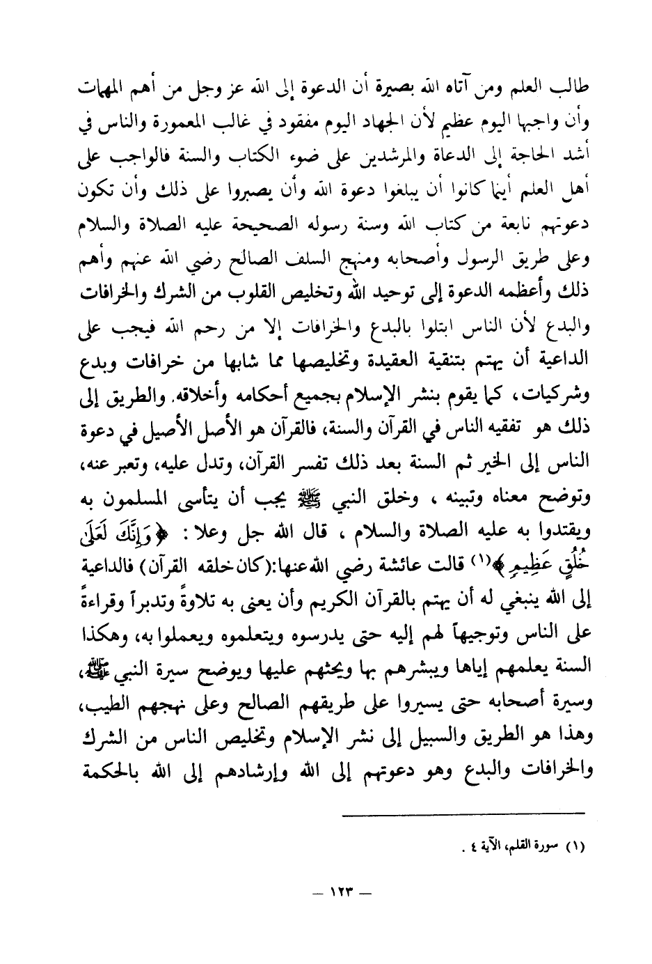 قال الله جل وعلا: {وَإِنَّكَ لَعَلى خُلُقٍ عَظِيمٍ} (¬1) قالت عائشة رضي الله عنها: كان خلقه القرآن فالداعية إلى الله ينبغي له أن يهتم بالقرآن الكريم وأن يعنى به تلاوة وتدبرا وقراءة على الناس وتوجيها لهم إليه حتى يدرسوه ويتعلموه ويعملوا به، وهكذا السنة يعلمهم إياها ويبشرهم بها ويحثهم عليها ويوضح سيرة النبي صلى الله عليه وسلم، وسيرة أصحابه حتى يسيروا على طريقهم الصالح وعلى نهجهم الطيب، وهذا هو الطريق والسبيل إلى نشر الإسلام وتخليص الناس من الشرك والخرافات والبدع وهو دعوتهم إلى الله وإرشادهم إلى الله بالحكمة