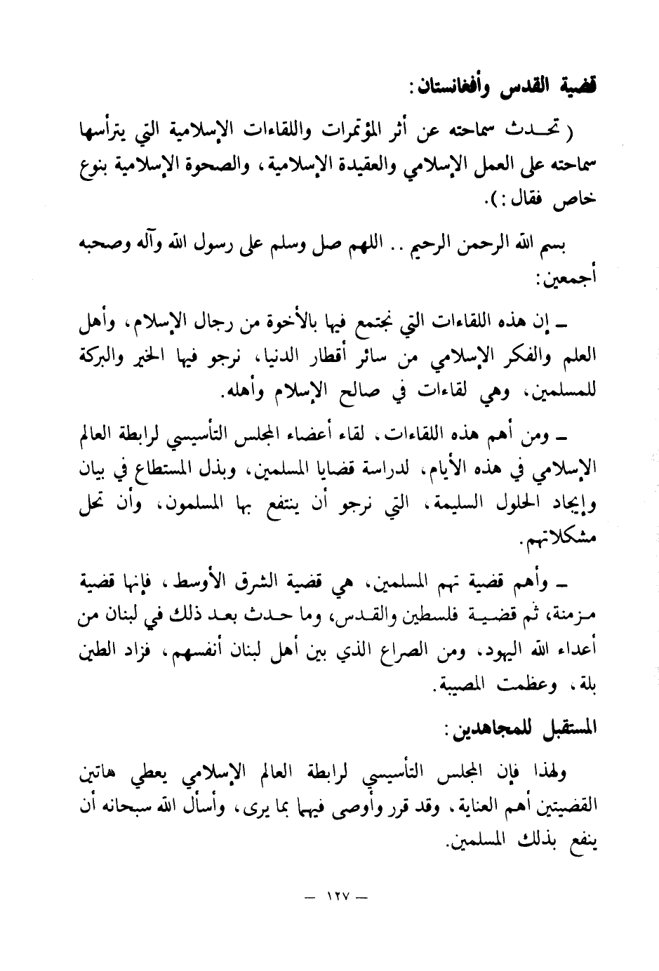 ولهذا فإن المجلس التأسيسي لرابطة العالم الإسلامي يعطي هاتين القضيتين أهم العناية، وقد قرر وأوصى فيهما بما يرى، وأسأل الله سبحانه أن ينفع بذلك المسلمين.