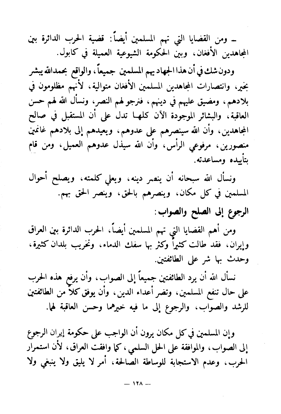 وإن المسلمين في كل مكان يرون أن الواجب على حكومة إيران الرجوع إلى الصواب، والموافقة على الحل السلمي، كما وافقت العراق؛ لأن استمرار الحرب، وعدم الاستجابة للوساطة الصالحة، أمر لا يليق ولا ينبغي ولا