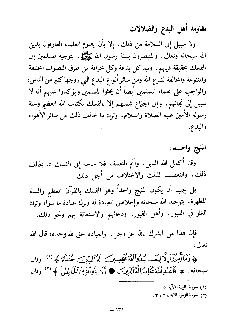 ولا سبيل إلى السلامة من ذلك، إلا بأن يقوم العلماء العارفون بدين الله سبحانه وتعالى، والمتبصرون بسنة رسول الله صلى الله عليه وسلم، بتوجيه المسلمين إلى التمسك بحقيقة دينهم، ونبذ كل بدعة وكل خرافة من طرق التصوف المختلفة والمتنوعة والمخالفة لشرع الله ومن سائر أنواع البدع التي روجها كثير من الناس، والواجب على علماء المسلمين أيضا أن يحثوا المسلمين ويؤكدوا عليهم أنه لا سبيل إلى نجاتهم، وإلى اجتماع شملهم إلا بالتمسك بكتاب الله العظيم وسنة رسوله الأمين عليه الصلاة والسلام، وترك ما خالف ذلك من سائر الأهواء والبدع.