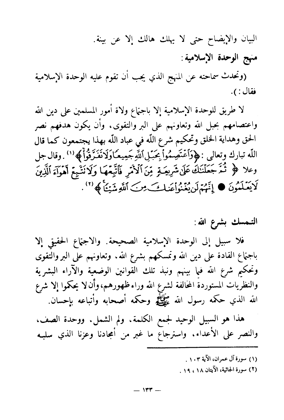فلا سبيل إلى الوحدة الإسلامية الصحيحة، والاجتماع الحقيقي إلا باجتماع القادة على دين الله وتمسكهم بشرع الله، وتعاونهم على البر والتقوى وتحكيم شرع الله فيما بينهم ونبذ تلك القوانين الوضعية والآراء البشرية والنظريات المستوردة المخالفة لشرع الله وراء ظهورهم، وأن لا يحكموا إلا شرع الله الذي حكمه رسول الله صلى الله عليه وسلم وحكمه أصحابه وأتباعه بإحسان.