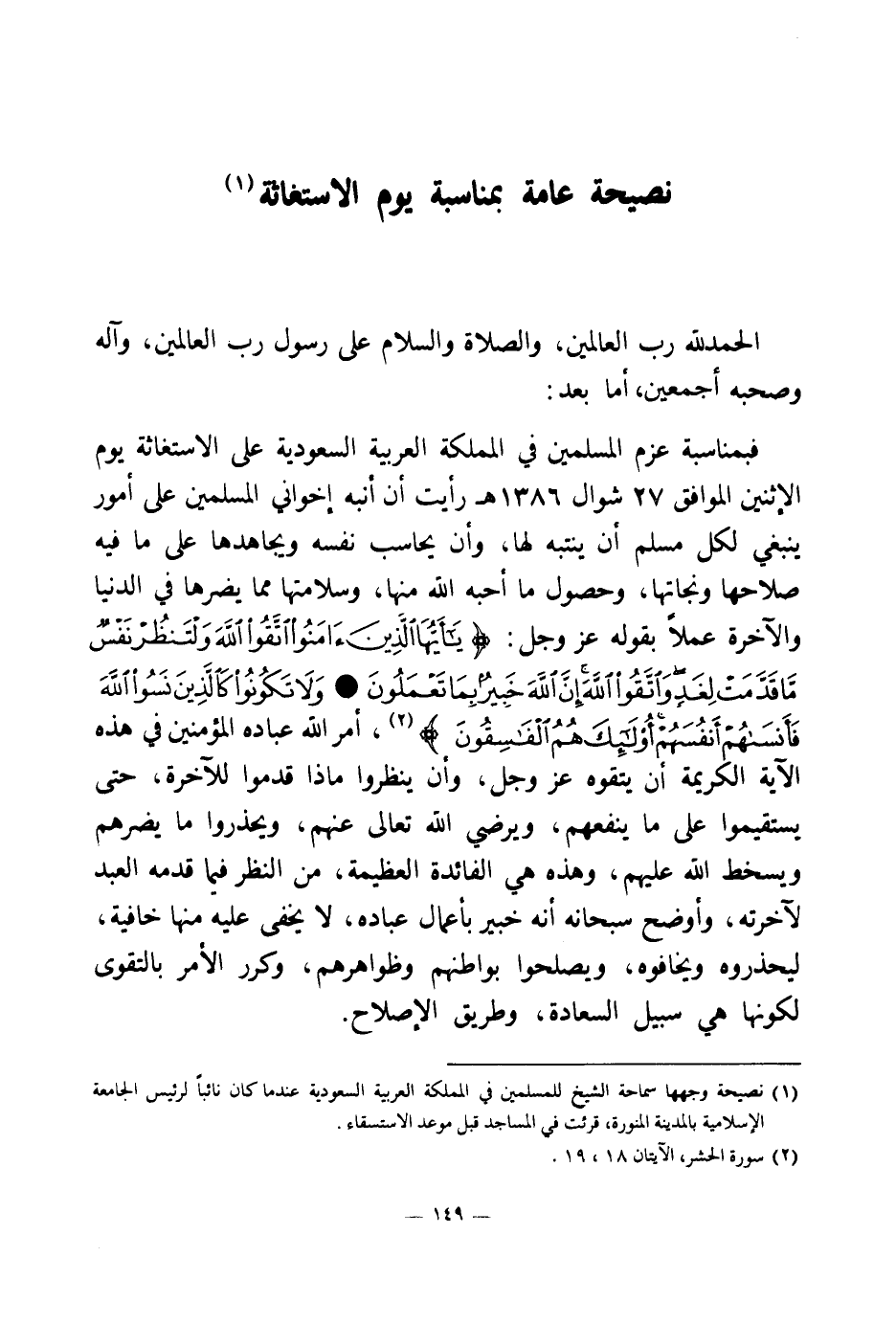فبمناسبة عزم المسلمين في المملكة العربية السعودية على الاستغاثة يوم الإثنين الموافق 27 شوال 1386 هـ رأيت أن أنبه إخواني المسلمين على أمور ينبغي لكل مسلم أن ينتبه لها، وأن يحاسب نفسه ويجاهدها على ما فيه صلاحها ونجاتها، وحصول ما أحبه الله منها، وسلامتها مما يضرها في الدنيا والآخرة عملا بقوله عز وجل: {يَا أَيُّهَا الَّذِينَ آمَنُوا اتَّقُوا اللَّهَ وَلْتَنْظُرْ نَفْسٌ مَا قَدَّمَتْ لِغَدٍ وَاتَّقُوا اللَّهَ إِنَّ اللَّهَ خَبِيرٌ بِمَا تَعْمَلُونَ} (¬1) {وَلَا تَكُونُوا كَالَّذِينَ نَسُوا اللَّهَ فَأَنْسَاهُمْ أَنْفُسَهُمْ أُولَئِكَ هُمُ الْفَاسِقُونَ} (¬2) أمر الله عباده المؤمنين في هذه الآية الكريمة أن يتقوه عز وجل، وأن ينظروا ماذا قدموا للآخرة، حتى يستقيموا على ما ينفعهم، ويرضي الله تعالى عنهم، ويحذروا ما يضرهم ويسخط الله عليهم، وهذه هي الفائدة العظيمة، من النظر فيما قدمه العبد لآخرته، وأوضح سبحانه أنه خبير بأعمال عباده، لا يخفى عليه منها خافية، ليحذروه ويخافوه، ويصلحوا بواطنهم وظواهرهم، وكرر الأمر بالتقوى لكونها هي سبيل السعادة، وطريق الإصلاح.