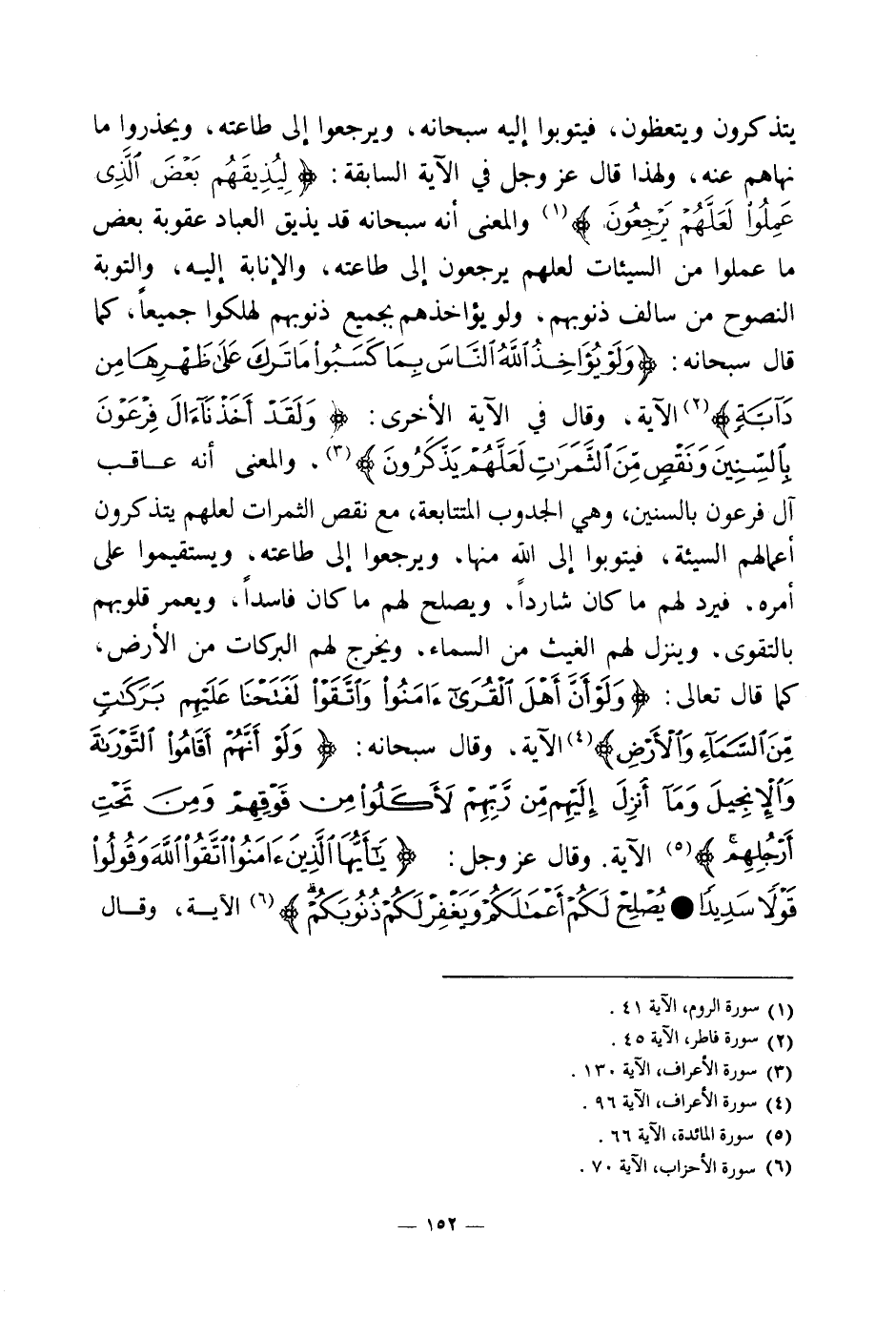 يتذكرون ويتعظون، فيتوبوا إليه سبحانه، ويرجعوا إلى طاعته، ويحذروا ما نهاهم عنه، ولهذا قال عز وجل في الآية السابقة: {لِيُذِيقَهُمْ بَعْضَ الَّذِي عَمِلُوا لَعَلَّهُمْ يَرْجِعُونَ} (¬1) والمعنى أنه سبحانه قد يذيق العباد عقوبة بعض ما عملوا من السيئات لعلهم يرجعون إلى طاعته، والإنابة إليه، والتوبة النصوح من سالف ذنوبهم، ولو يؤاخذهم بجميع ذنوبهم لهلكوا جميعا، كما قال سبحانه: {وَلَوْ يُؤَاخِذُ اللَّهُ النَّاسَ بِمَا كَسَبُوا مَا تَرَكَ عَلَى ظَهْرِهَا مِنْ دَابَّةٍ} (¬2) الآية، وقال في الآية الأخرى: {وَلَقَدْ أَخَذْنَا آلَ فِرْعَوْنَ بِالسِّنِينَ وَنَقْصٍ مِنَ الثَّمَرَاتِ لَعَلَّهُمْ يَذَّكَّرُونَ} (¬3) والمعنى أنه عاقب آل فرعون بالسنين، وهي الجدوب المتتابعة، مع نقص الثمرات لعلهم يتذكرون أعمالهم السيئة، فيتوبوا إلى الله منها، ويرجعوا إلى طاعته، ويستقيموا على أمره، فيرد لهم ما كان شاردا، ويصلح لهم ما كان فاسدا، ويعمر قلوبهم بالتقوى، وينزل لهم الغيث من السماء، ويخرج لهم البركات من الأرض، كما قال تعالى: {وَلَوْ أَنَّ أَهْلَ الْقُرَى آمَنُوا وَاتَّقَوْا لَفَتَحْنَا عَلَيْهِمْ بَرَكَاتٍ مِنَ السَّمَاءِ وَالْأَرْضِ} (¬4) الآية، وقال سبحانه: {وَلَوْ أَنَّهُمْ أَقَامُوا التَّوْرَاةَ وَالْإِنْجِيلَ وَمَا أُنْزِلَ إِلَيْهِمْ مِنْ رَبِّهِمْ لَأَكَلُوا مِنْ فَوْقِهِمْ وَمِنْ تَحْتِ أَرْجُلِهِمْ} (¬5) الآية. وقال عز وجل: {يَا أَيُّهَا الَّذِينَ آمَنُوا اتَّقُوا اللَّهَ وَقُولُوا قَوْلًا سَدِيدًا} (¬6) {يُصْلِحْ لَكُمْ أَعْمَالَكُمْ وَيَغْفِرْ لَكُمْ ذُنُوبَكُمْ} (¬7) الآية، وقال