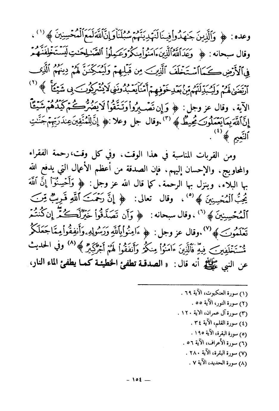 ومن القربات المناسبة في هذا الوقت، وفي كل وقت رحمة الفقراء والمحاويج، والإحسان إليهم، فإن الصدقة من أعظم الأعمال التي يدفع الله بها البلاء، وينزل بها الرحمة، كما قال الله عز وجل: {وَأَحْسِنُوا إِنَّ اللَّهَ يُحِبُّ الْمُحْسِنِينَ} (¬5) وقال تعالى: {إِنَّ رَحْمَتَ اللَّهِ قَرِيبٌ مِنَ الْمُحْسِنِينَ} (¬6) وقال سبحانه: {وَأَنْ تَصَدَّقُوا خَيْرٌ لَكُمْ إِنْ كُنْتُمْ تَعْلَمُونَ} (¬7) وقال عز وجل: {آمِنُوا بِاللَّهِ وَرَسُولِهِ وَأَنْفِقُوا مِمَّا جَعَلَكُمْ مُسْتَخْلَفِينَ فِيهِ فَالَّذِينَ آمَنُوا مِنْكُمْ وَأَنْفَقُوا لَهُمْ أَجْرٌ كَبِيرٌ} (¬8) وفي الحديث عن النبي صلى الله عليه وسلم أنه قال: