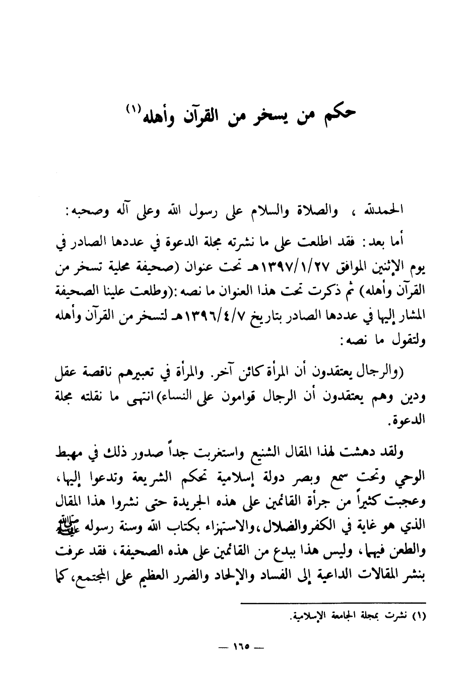 أما بعد: فقد اطلعت على ما نشرته مجلة الدعوة في عددها الصادر في يوم الإثنين الموافق 27 \ 1 \ 1397 هـ تحت عنوان ((صحيفة محلية تسخر من القرآن وأهله)) ثم ذكرت تحت هذا العنوان ما نصه: وطلعت علينا الصحيفة المشار إليها في عددها الصادر بتاريخ 7 \ 4 \ 1397 هـ لتسخر من القرآن وأهله ولتقول ما نصه: