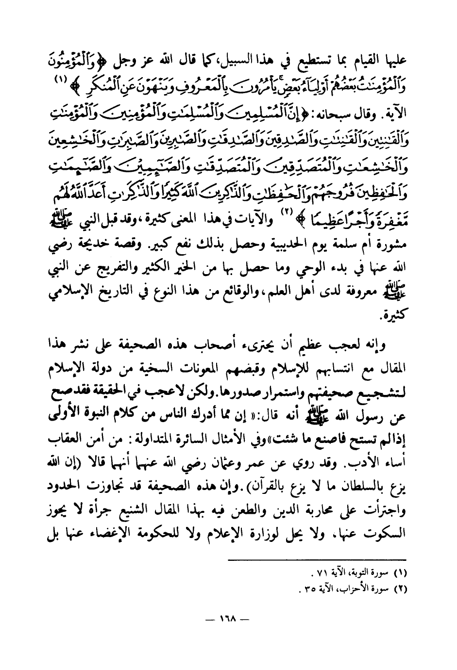 وإنه لعجب عظيم أن يجترئ أصحاب هذه الصحيفة على نشر هذا المقال مع انتسابهم للإسلام وقبضهم المعونات السخية من دولة الإسلام لتشجيع صحيفتهم واستمرار صدورها. ولكن لا عجب في الحقيقة فقد صح عن رسول الله صلى الله عليه وسلم أنه قال: «إن مما أدرك الناس من كلام النبوة الأولى إذا لم تستح فاصنع ما شئت (¬3) » وفي الأمثال السائرة المتداولة: من أمن العقاب أساء الأدب. وقد روي عن عمر وعثمان رضي الله عنهما أنهما قالا: إن الله يزع بالسلطان ما لا يزع بالقرآن. وإن هذه الصحيفة قد تجاوزت الحدود واجترأت على محاربة الدين والطعن فيه بهذا المقال الشنيع جرأة لا يجوز السكوت عنها، ولا يحل لوزارة الإعلام ولا للحكومة الإغضاء عنها بل