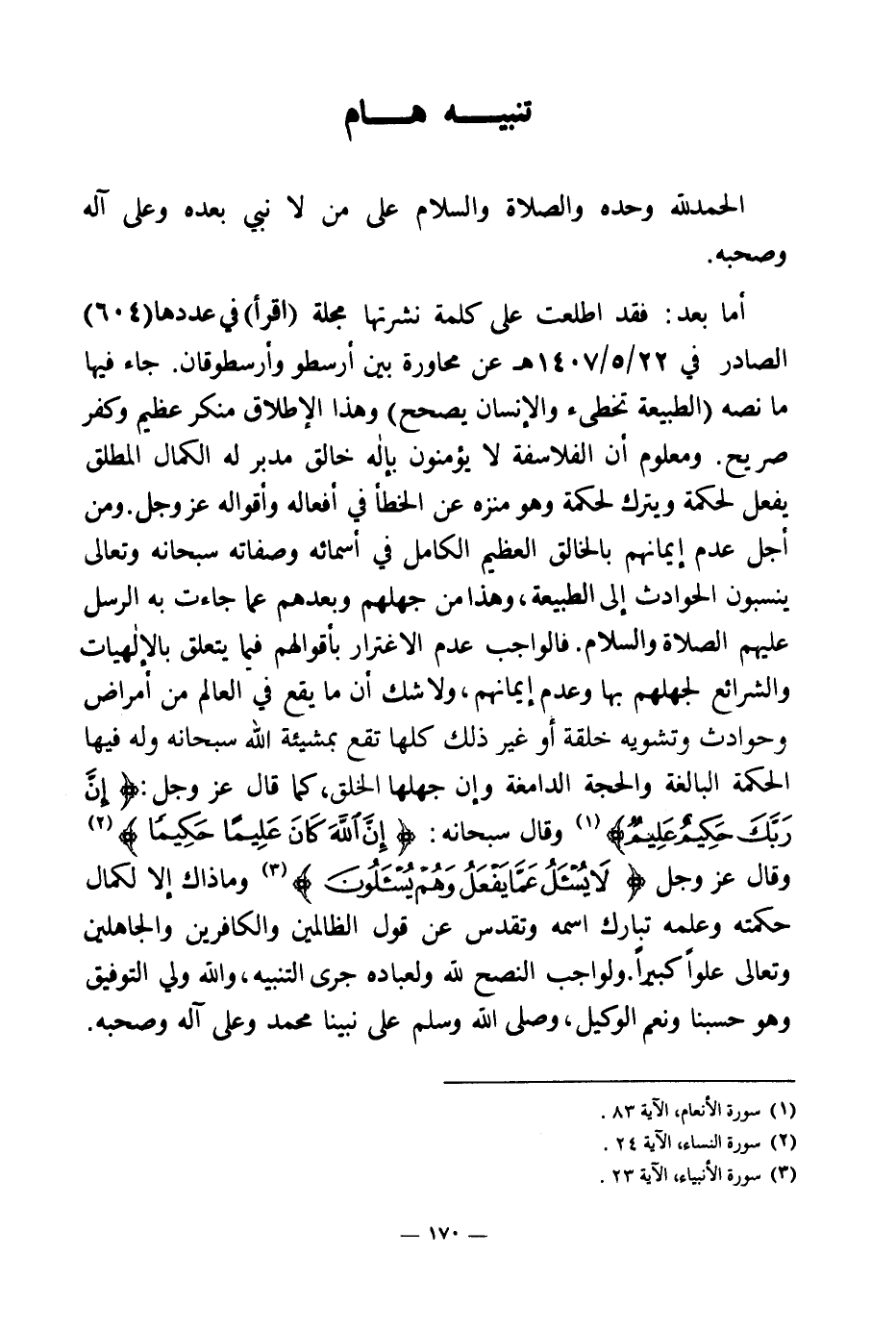 أما بعد: فقد اطلعت على كلمة نشرتها مجلة (اقرأ) في عددها (604) الصادر في 22 \ 5 \ 1407 هـ عن محاورة بين أرسطو وأرسطوقان. جاء فيها ما نصه (الطبيعة تخطئ والإنسان يصحح) وهذا الإطلاق منكر عظيم وكفر صريح. ومعلوم أن الفلاسفة لا يؤمنون بإله خالق مدبر له الكمال المطلق يفعل لحكمة ويترك لحكمة وهو منزه عن الخطأ في أفعاله وأقواله عز وجل. ومن أجل عدم إيمانهم بالخالق العظيم الكامل في أسمائه وصفاته سبحانه وتعالى ينسبون الحوادث إلى الطبيعة، وهذا من جهلهم وبعدهم عما جاءت به الرسل عليهم الصلاة والسلام. فالواجب عدم الاغترار بأقوالهم فيما يتعلق بالإلهيات والشرائع لجهلهم بها وعدم إيمانهم، ولا شك أن ما يقع في العالم من أمراض وحوادث وتشويه خلقة أو غير ذلك كلها تقع بمشيئة الله سبحانه وله فيها الحكمة البالغة والحجة الدامغة وإن جهلها الخلق، كما قال عز وجل: {إِنَّ رَبَّكَ حَكِيمٌ عَلِيمٌ} (¬1) وقال سبحانه: {إِنَّ اللَّهَ كَانَ عَلِيمًا حَكِيمًا} (¬2) وقال عز وجل {لَا يُسْأَلُ عَمَّا يَفْعَلُ وَهُمْ يُسْأَلُونَ} (¬3) وما ذاك إلا لكمال حكمته وعلمه تبارك اسمه وتقدس عن قول الظالمين والكافرين والجاهلين وتعالى علوا كبيرا. ولواجب النصح لله ولعباده جرى التنبيه، والله ولي التوفيق وهو حسبنا ونعم الوكيل، وصلى الله وسلم على نبينا محمد وعلى آله وصحبه.