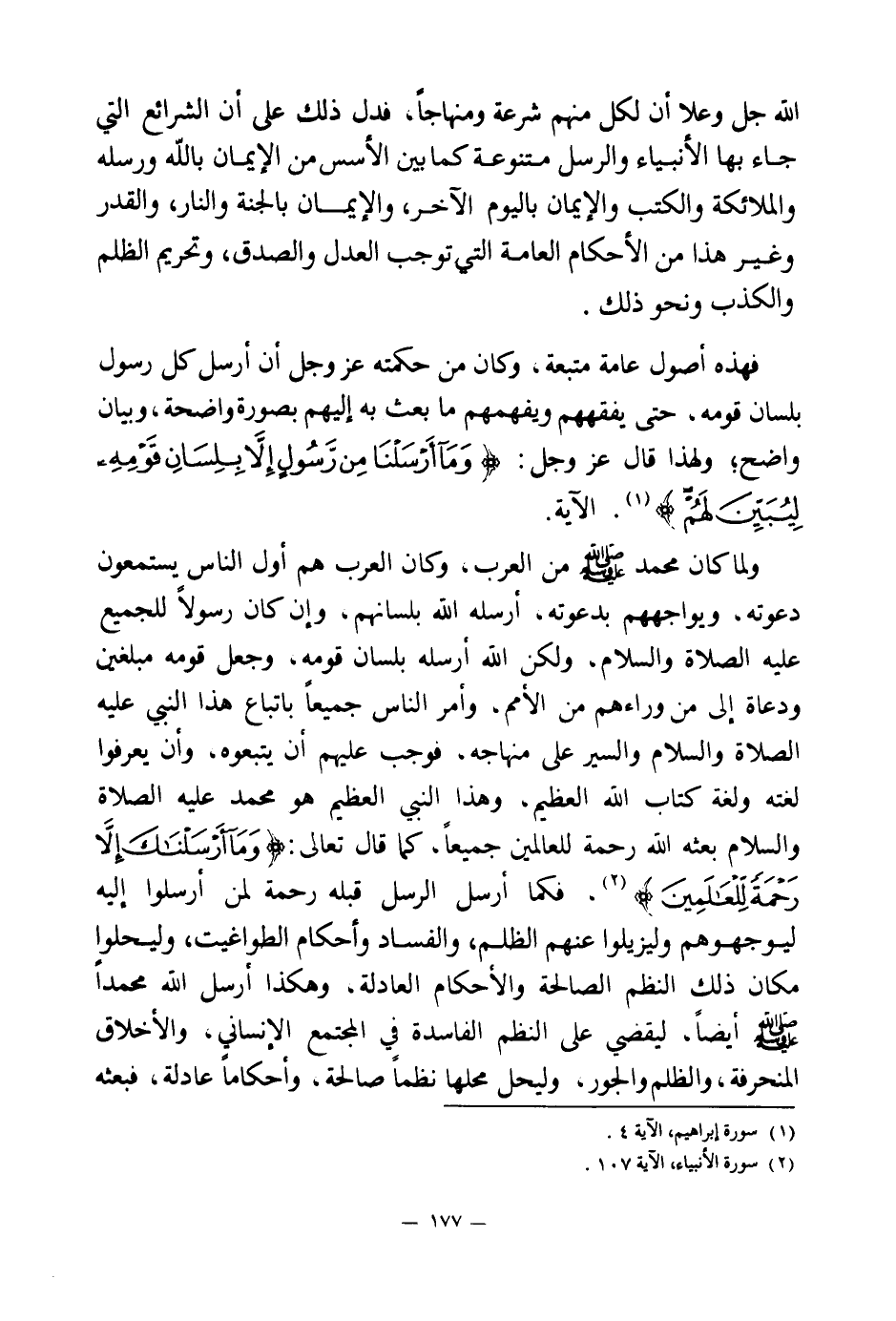 ولما كان محمد صلى الله عليه وسلم من العرب، وكان العرب هم أول الناس يستمعون دعوته، ويواجههم بدعوته، أرسله الله بلسانهم، وإن كان رسولا للجميع عليه الصلاة والسلام، ولكن الله أرسله بلسان قومه، وجعل قومه مبلغين ودعاة إلى من وراءهم من الأمم، وأمر الناس جميعا باتباع هذا النبي عليه الصلاة والسلام والسير على منهاجه، فوجب عليهم أن يتبعوه، وأن يعرفوا لغته ولغة كتاب الله العظيم، وهذا النبي العظيم هو محمد عليه الصلاة والسلام بعثه الله رحمة للعالمين جميعا، كما قال تعالى: {وَمَا أَرْسَلْنَاكَ إِلَّا رَحْمَةً لِلْعَالَمِينَ} (¬2) فكما أرسل الرسل قبله رحمة لمن أرسلوا إليه ليواجهوهم وليزيلوا عنهم الظلم، والفساد وأحكام الطواغيت، وليحلوا مكان ذلك النظم الصالحة والأحكام العادلة، وهكذا أرسل الله محمدا صلى الله عليه وسلم أيضا، ليقضي على النظم الفاسدة في المجتمع الإنساني، والأخلاق المنحرفة، والظلم والجور، وليحل محلها نظما صالحة، وأحكاما عادلة، فبعثه
