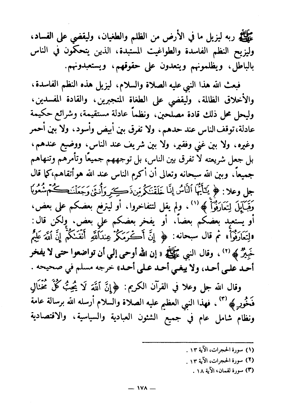 فبعث الله هذا النبي عليه الصلاة والسلام، ليزيل هذه النظم الفاسدة، والأخلاق الظالمة، وليقضي على الطغاة المتجبرين، والقادة المفسدين، وليحل محل ذلك قادة مصلحين، ونظما عادلة مستقيمة، وشرائع حكيمة عادلة، توقف الناس عند حدهم، ولا تفرق بين أبيض وأسود، ولا بين أحمر وغيره، ولا بين غني وففير، ولا بين شريف عند الناس، ووضيع عندهم، بل جعل شريعته لا تفرق بين الناس، بل توجههم جميعا وتأمرهم وتنهاهم جميعا، وبين الله سبحانه وتعالى أن أكرم الناس عند الله هو أتقاهم، كما قال جل وعلا: {يَا أَيُّهَا النَّاسُ إِنَّا خَلَقْنَاكُمْ مِنْ ذَكَرٍ وَأُنْثَى وَجَعَلْنَاكُمْ شُعُوبًا وَقَبَائِلَ لِتَعَارَفُوا} (¬1) ولم يقل لتتفاخروا، أو ليترفع بعضكم على بعض، أو يستعبد بعضكم بعضا، أو يفخر بعضكم على بعض، ولكن قال: " لتعارفوا " ثم قال سبحانه: {إِنَّ أَكْرَمَكُمْ عِنْدَ اللَّهِ أَتْقَاكُمْ إِنَّ اللَّهَ عَلِيمٌ خَبِيرٌ} (¬2) وقال النبي صلى الله عليه وسلم: «إن الله أوحى إلي أن تواضعوا حتى لا يفخر أحد على أحد ولا يبغي أحد على أحد (¬3) » خرجه مسلم في صحيحه.