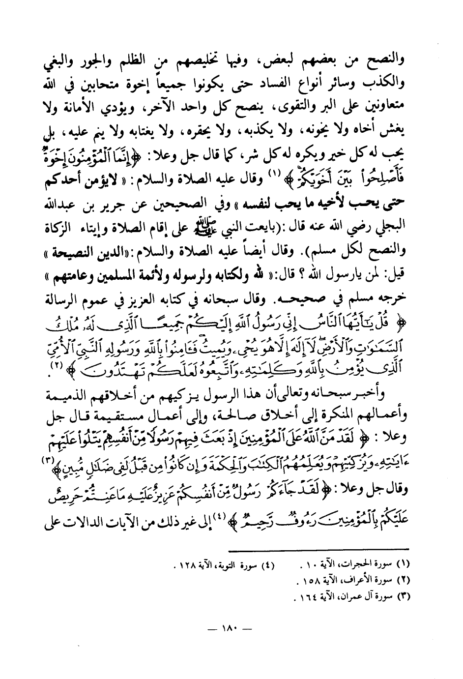 والنصح من بعضهم لبعض، وفيها تخليصهم من الظلم والجور والبغي والكذب وسائر أنواع الفساد حتى يكونوا جميعا إخوة متحابين في الله متعاونين على البر والتقوى، ينصح كل واحد الآخر، ويؤدي الأمانة ولا يغش أخاه ولا يخونه، ولا يكذبه، ولا يحقره، ولا يغتابه ولا ينم عليه، بل يحب له كل خير ويكره له كل شر، كما قال جل وعلا: {إِنَّمَا الْمُؤْمِنُونَ إِخْوَةٌ فَأَصْلِحُوا بَيْنَ أَخَوَيْكُمْ} (¬1) وقال عليه الصلاة والسلام: «لا يؤمن أحدكم حتى يحب لأخيه ما يحب لنفسه (¬2) » وفي الصحيحين عن جرير بن عبد الله البجلي رضي الله عنه قال: «بايعت النبي صلى الله عليه وسلم على إقام الصلاة وإيتاء الزكاة والنصح لكل مسلم (¬3) » . وقال أيضا عليه الصلاة والسلام: «الدين النصيحة، قيل: لمن يا رسول الله؟ قال: لله ولكتابه ولرسوله ولأئمة المسلمين وعامتهم (¬4) » خرجه مسلم في صحيحه. وقال سبحانه في كتابه العزيز في عموم الرسالة: {قُلْ يَا أَيُّهَا النَّاسُ إِنِّي رَسُولُ اللَّهِ إِلَيْكُمْ جَمِيعًا الَّذِي لَهُ مُلْكُ السَّمَاوَاتِ وَالْأَرْضِ لَا إِلَهَ إِلَّا هُوَ يُحْيِي وَيُمِيتُ فَآمِنُوا بِاللَّهِ وَرَسُولِهِ النَّبِيِّ الْأُمِّيِّ الَّذِي يُؤْمِنُ بِاللَّهِ وَكَلِمَاتِهِ وَاتَّبِعُوهُ لَعَلَّكُمْ تَهْتَدُونَ} (¬5)