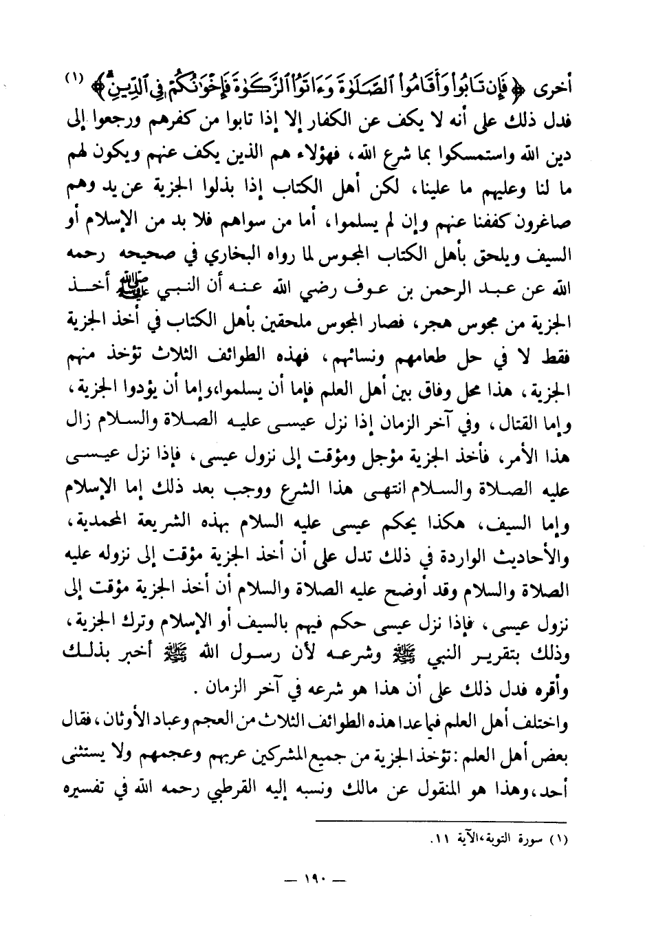 فدل ذلك على أنه لا يكف عن الكفار إلا إذا تابوا من كفرهم ورجعوا إلى دين الله واستمسكوا بما شرع الله، فهؤلاء هم الذين يكف عنهم ويكون لهم ما لنا وعليهم ما علينا، لكن أهل الكتاب إذا بذلوا الجزية عن يد وهم صاغرون كففنا عنهم وإن لم يسلموا، أما من سواهم فلا بد من الإسلام أو السيف ويلحق بأهل الكتاب المجوس لما رواه البخاري في صحيحه - رحمه الله - عن عبد الرحمن بن عوف رضي الله عنه «أن النبي صلى الله عليه وسلم أخذ الجزية من مجوس هجر (¬2) » ، فصار المجوس ملحقين بأهل الكتاب في أخذ الجزية فقط لا في حل طعامهم ونسائهم، فهذه الطوائف الثلاث تؤخذ منهم الجزية، هذا محل وفاق بين أهل العلم فإما أن يسلموا وإما أن يؤدوا الجزية، وإما القتال، وفي آخر الزمان إذا نزل عيسى - عليه الصلاة والسلام - زال هذا الأمر، فأخذ الجزية مؤجل ومؤقت إلى نزول عيسى، فإذا نزل عيسى - عليه الصلاة والسلام - انتهى هذا الشرع ووجب بعد ذلك إما الإسلام وإما السيف، هكذا يحكم عيسى عليه السلام بهذه الشريعة المحمدية، والأحاديث الواردة في ذلك تدل على أن أخذ الجزية مؤقت إلى نزوله عليه الصلاة والسلام، وقد أوضح عليه الصلاة والسلام أن أخذ الجزية مؤقت إلى نزول عيسى، فإذا نزل عيسى حكم فيهم بالسيف أو الإسلام وترك الجزية، وذلك بتقرير النبي - صلى الله عليه وسلم - وشرعه لأن رسول الله - صلى الله عليه وسلم - أخبر بذلك وأقره فدل ذلك على أن هذا هو شرعه في آخر الزمان.
