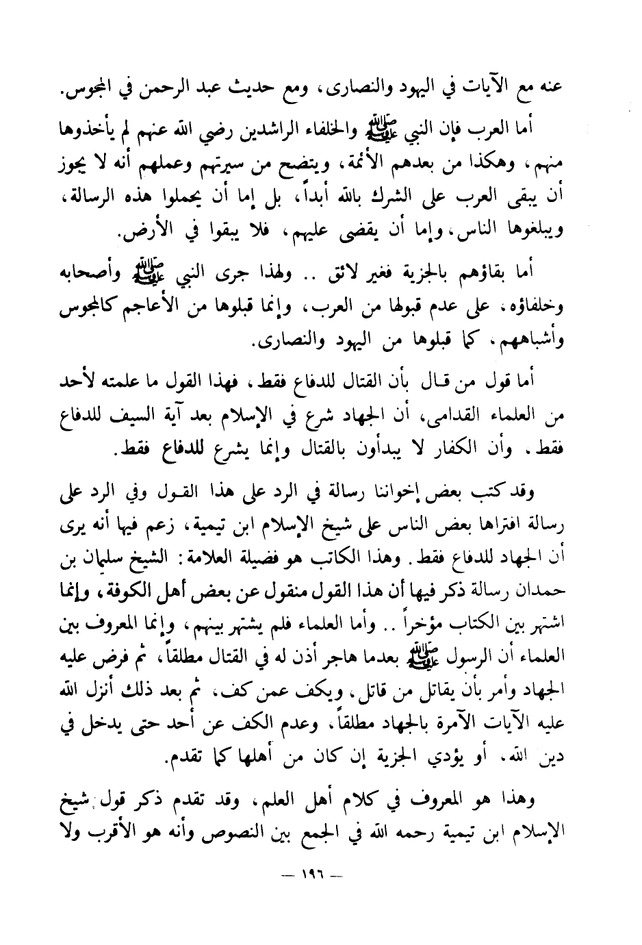 وقد كتب بعض إخواننا رسالة في الرد على هذا القول، وفي الرد على رسالة افتراها بعض الناس على شيخ الإسلام ابن تيمية، زعم فيها أنه يرى أن الجهاد للدفاع فقط. وهذا الكاتب هو فضيلة العلامة: الشيخ سليمان بن حمدان رسالة ذكر فيها أن هذا القول منقول عن بعض أهل الكوفة، وإنما اشتهر بين الكتاب مؤخرا. . وأما العلماء فلم يشتهر بينهم، وإنما المعروف بين العلماء أن الرسول صلى الله عليه وسلم بعدما هاجر أذن له في القتال مطلقا، ثم فرض عليه الجهاد وأمر بأن يقاتل من قاتل، ويكف عمن كف، ثم بعد ذلك أنزل الله عليه الآيات الآمرة بالجهاد مطلقا، وعدم الكف عن أحد حتى يدخل في دين الله، أو يؤدي الجزية إن كان من أهلها كما تقدم.