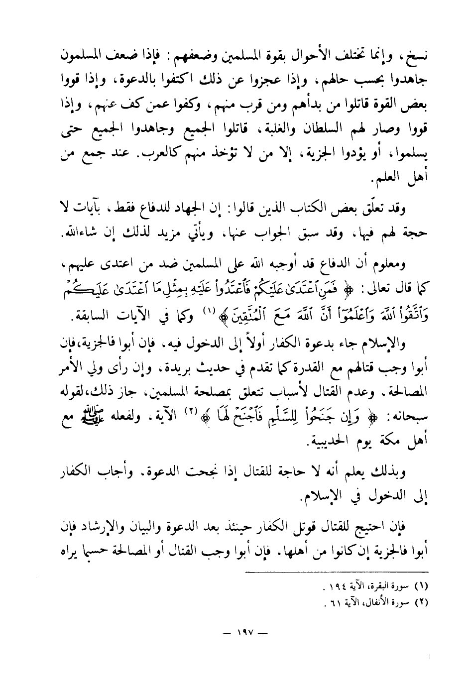 نسخ، وإنما تختلف الأحوال بقوة المسلمين وضعفهم: فإذا ضعف المسلمون جاهدوا بحسن حالهم، وإذا عجزوا عن ذلك اكتفوا بالدعوة، وإذا قووا بعض القوة قاتلوا من بدأهم ومن قرب منهم، وكفوا عمن كف عنهم، وإذا قووا وصار لهم السلطان والغلبة، قاتلوا الجميع وجاهدوا الجميع حتى يسلموا، أو يؤدوا الجزية، إلا من لا تؤخذ منهم كالعرب. عند جمع من أهل العلم.
