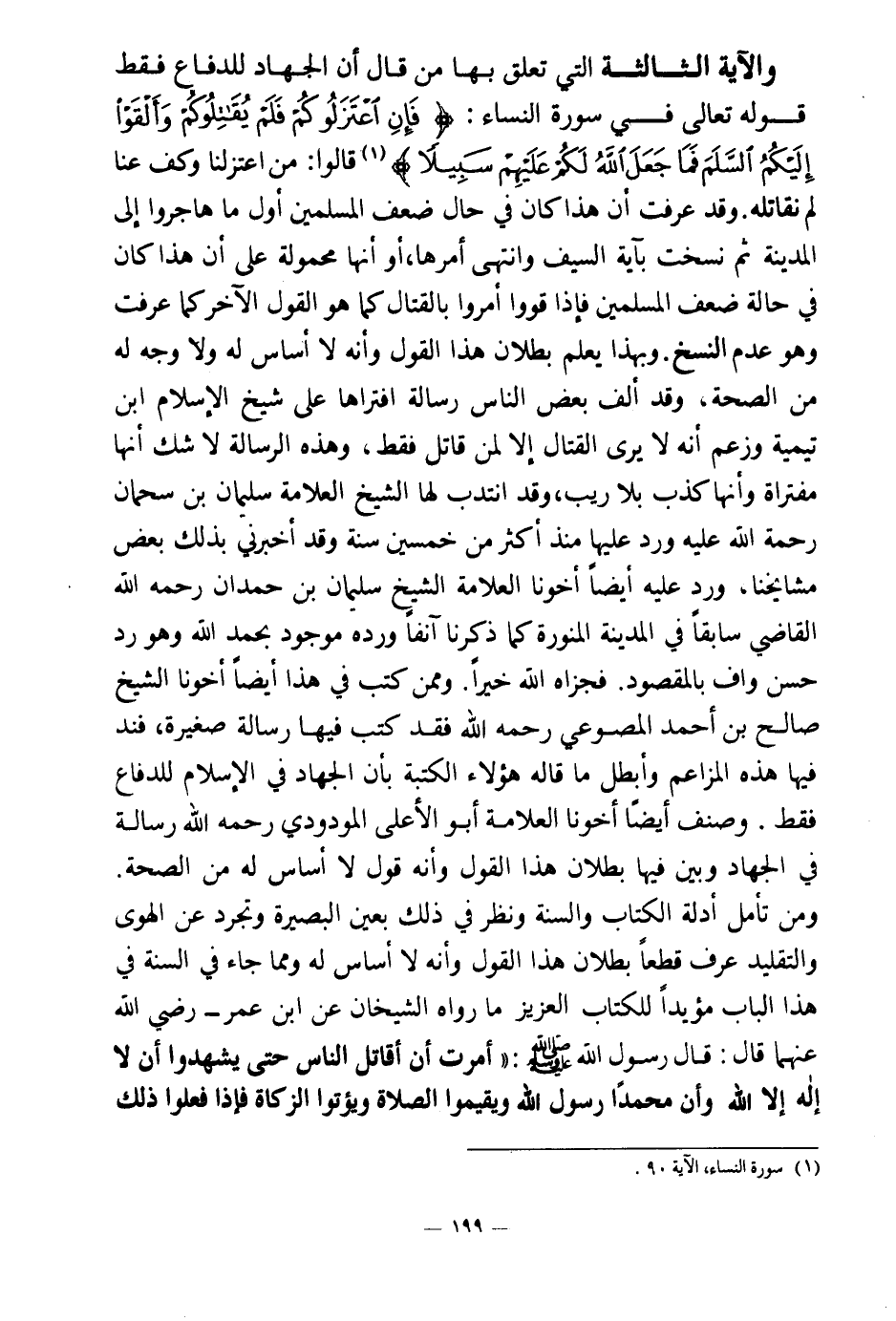 وممن كتب في هذا أيضا أخونا الشيخ صالح بن أحمد المصوعي - رحمه الله - فقد كتب فيها رسالة صغيرة، فند فيها هذه المزاعم وأبطل ما قاله هؤلاء الكتبة بأن الجهاد في الإسلام للدفاع فقط. وصنف أيضا أخونا العلامة أبو الأعلى المودودي - رحمه الله - رسالة في الجهاد وبين فيها بطلان هذا القول وأنه قول لا أساس له من الصحة. ومن تأمل أدلة الكتاب والسنة ونظر في ذلك بعين البصيرة وتجرد عن الهوى والتقليد عرف قطعا بطلان هذا القول وأنه لا أساس له، ومما جاء في السنة في هذا الباب مؤيدا للكتاب العزيز ما رواه الشيخان عن ابن عمر - رضي الله عنهما - قال: قال رسول الله صلى الله عليه وسلم: «أمرت أن أقاتل الناس حتى يشهدوا أن لا إله إلا الله وأن محمدا رسول الله ويقيموا الصلاة ويؤتوا الزكاة، فإذا فعلوا