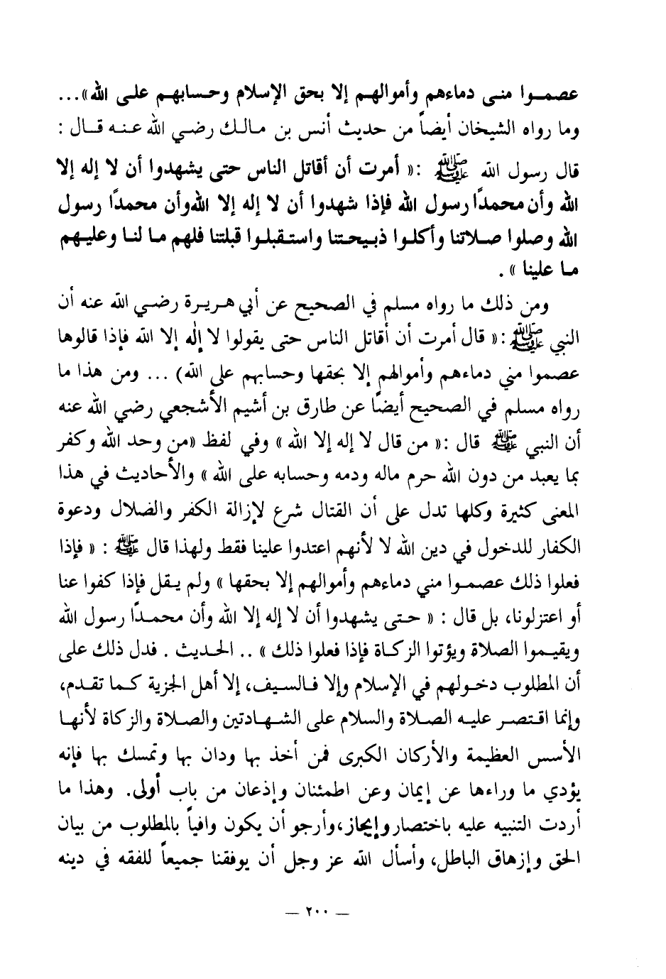 ومن ذلك ما رواه مسلم في الصحيح عن أبي هريرة - رضي الله عنه - أن النبي صلى الله عليه وسلم قال: «أمرت أن أقاتل الناس حتى يقولوا لا إله إلا الله فإذا قالوها عصموا مني دماءهم وأموالهم إلا بحقها وحسابهم على الله (¬3) » . . . ومن هذا ما رواه مسلم في الصحيح أيضا عن طارق بن أشيم الأشجعي - رضي الله عنه - أن النبي - صلى الله عليه وسلم - قال: من قال لا إله إلا الله وفي لفظ «من وحد الله وكفر بما يعبد من دون الله حرم ماله ودمه وحسابه على الله (¬4) » . والأحاديث في هذا المعنى كثيرة وكلها تدل على أن القتال شرع لإزالة الكفر والضلال ودعوة الكفار للدخول في دين الله - لا لأنهم اعتدوا علينا فقط ولهذا قال - صلى الله عليه وسلم -: «فإذا فعلوا ذلك عصموا مني دماءهم وأموالهم إلا بحقها (¬5) » ولم يقل فإذا كفوا عنا أو اعتزلونا، بل قال: «حتى يشهدوا أن لا إله إلا الله وأن محمدا رسول الله ويقيموا الصلاة ويؤتوا الزكاة فإذا فعلوا ذلك (¬6) » . . الحديث "، فدل ذلك على أن المطلوب دخولهم في الإسلام وإلا فالسيف، إلا أهل الجزية كما تقدم، وإنما اقتصر عليه الصلاة والسلام على الشهادتين والصلاة والزكاة لأنها الأسس العظيمة والأركان الكبرى فمن أخذ بها ودان بها وتمسك بها فإنه يؤدي ما وراءها عن إيمان وعن اطمئنان وإذعان من باب أولى. وهذا ما أردت التنبيه عليه باختصار وإيجاز، وأرجو أن يكون وافيا بالمطلوب من بيان الحق وإزهاق الباطل، وأسأل الله عز وجل أن يوفقنا جميعا للفقه في دينه