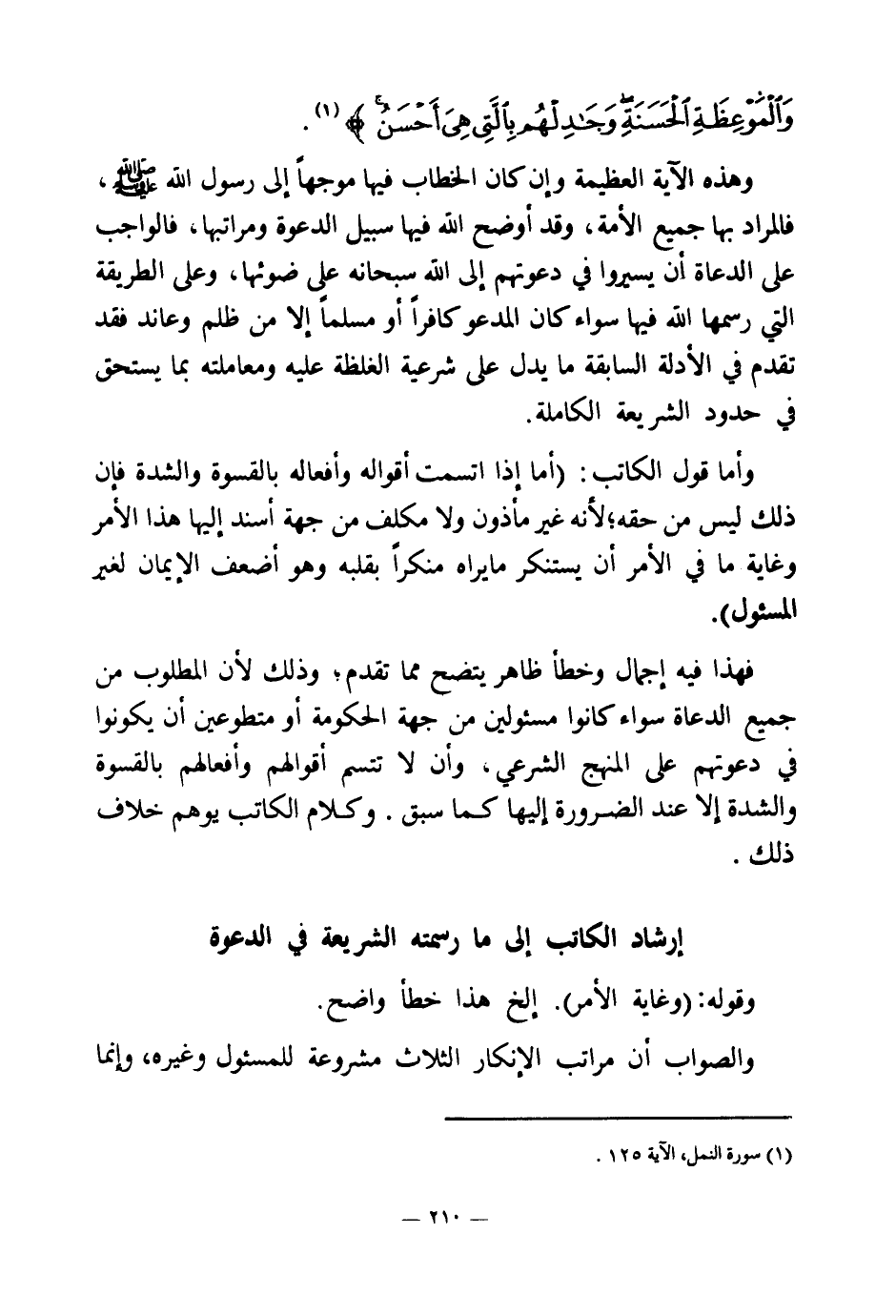 وهذه الآية العظيمة وإن كان الخطاب فيها موجها إلى رسول الله صلى الله عليه وسلم، فالمراد بها جميع الأمة، وقد أوضح الله فيها سبيل الدعوة ومراتبها، فالواجب على الدعاة أن يسيروا في دعوتهم إلى الله سبحانه على ضوئها، وعلى الطريقة التي رسمها الله فيها سواء كان المدعو كافرا أو مسلما إلا من ظلم وعاند فقد تقدم في الأدلة السابقة ما يدل على شرعية الغلظة عليه ومعاملته بما يستحق في حدود الشريعة الكاملة.