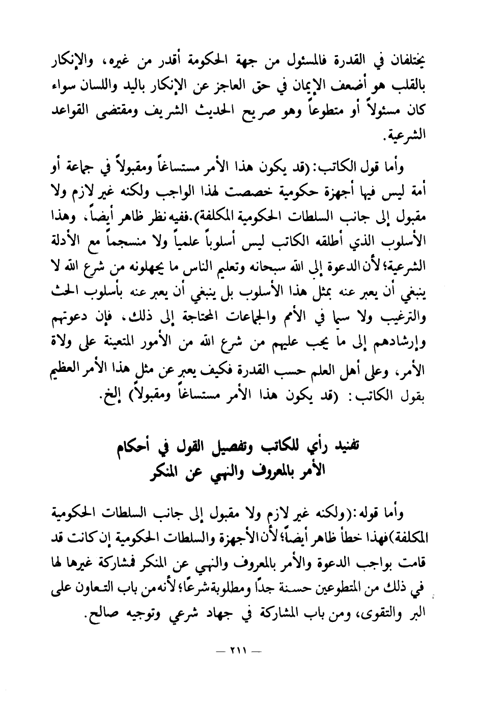 وأما قول الكاتب: (قد يكون هذا الأمر مستساغا ومقبولا في جماعة أو أمة ليس فيها أجهزة حكومية خصصت لهذا الواجب ولكنه غير لازم ولا مقبول إلى جانب السلطات الحكومية المكلفة) ففيه نظر ظاهر أيضا، وهذا الأسلوب الذي أطلقه الكاتب ليس أسلوبا علميا ولا منسجما مع الأدلة الشرعية لأن الدعوة إلى الله سبحانه وتعليم الناس ما يجهلونه من شرع الله لا ينبغي أن يعبر عنه بمثل هذا الأسلوب بل ينبغي أن يعبر عنه بأسلوب الحث والترغيب ولا سيما في الأمم والجماعات المحتاجة إلى ذلك، فإن دعوتهم وإرشادهم إلى ما يجب عليهم من شرع الله من الأمور المتعينة على ولاة الأمر، وعلى أهل العلم حسب القدرة فكيف يعبر عن مثل هذا الأمر العظيم بقول الكاتب: (قد يكون هذا الأمر مستساغا ومقبولا) ؟ إلخ.