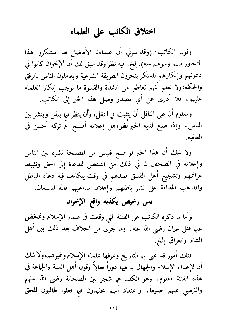 وقول الكاتب: وقد سرني أن علماءنا الأفاضل قد استنكروا هذا التجاوز منهم ونهوهم عنه. إلخ. فيه نظر وقد سبق لك أن الإخوان كانوا في دعوتهم وإنكارهم للمنكر يتحرون الطريقة الشرعية ويعاملون الناس بالرفق والحكمة، ولا نعلم أنهم تعاطوا من الشدة والقسوة ما يوجب إنكار العلماء عليهم، فلا أدري عن أي مصدر وصل هذا الخبر إلى الكاتب.