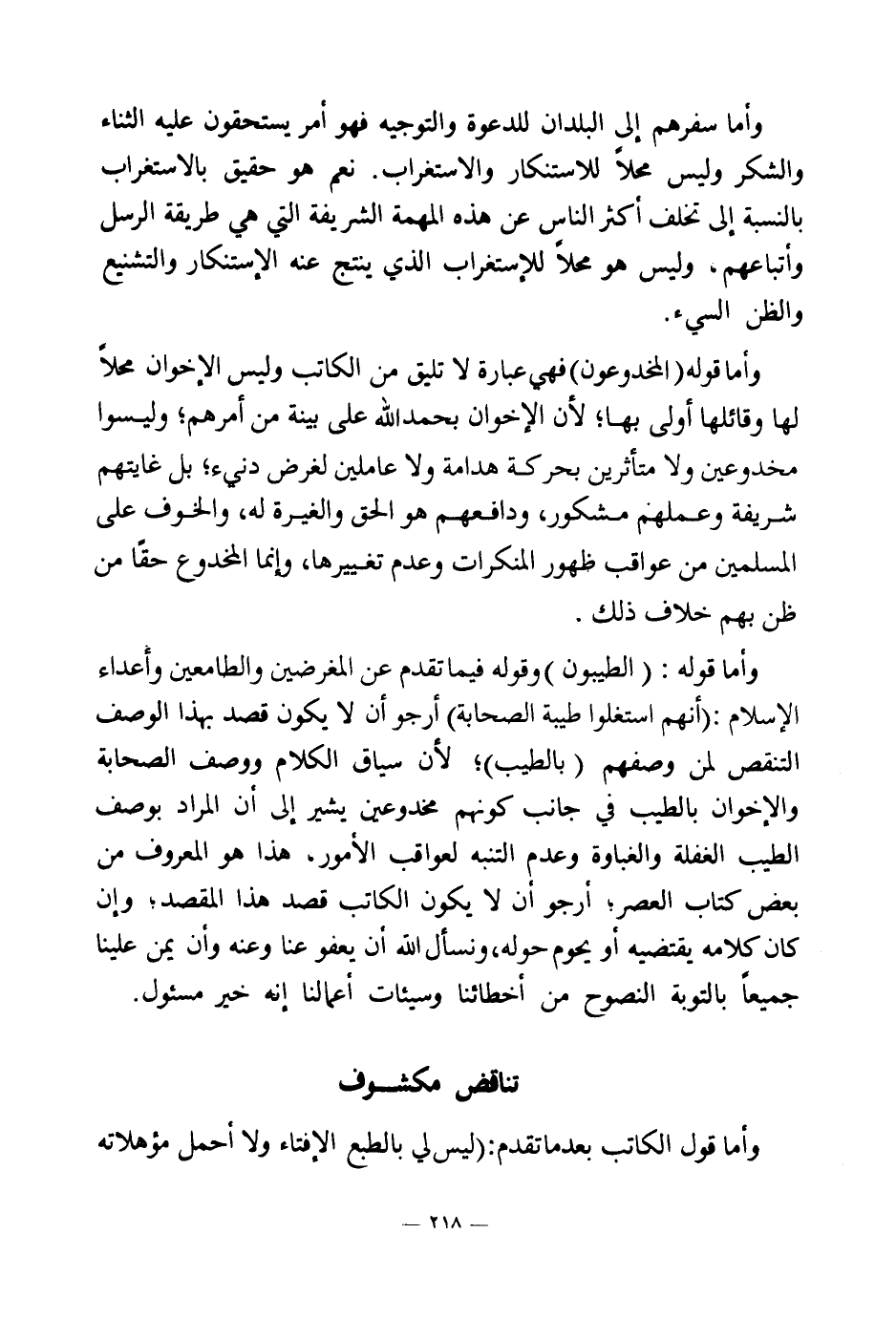 وأما قوله - الطيبون - وقوله فيما تقدم عن المغرضين والطامعين وأعداء الإسلام أنهم استغلوا طيبة الصحابة، أرجو أن لا يكون قصد بهذا الوصف التنقص لمن وصفهم - بالطيب - لأن سياق الكلام ووصف الصحابة والإخوان بالطيب في جانب كونهم مخدوعين يشير إلى أن المراد بوصف الطيب الغفلة والغباوة وعدم التنبه لعواقب الأمور، هذا هو المعروف من بعض كتاب العصر؛ أرجو أن لا يكون الكاتب قصد هذا المقصد؛ وإن كان كلامه يقتضيه أو يحوم حوله، ونسأل الله أن يعفو عنا وعنه وأن يمن علينا جميعا بالتوبة النصوح من أخطائنا وسيئات أعمالنا إنه خير مسئول.