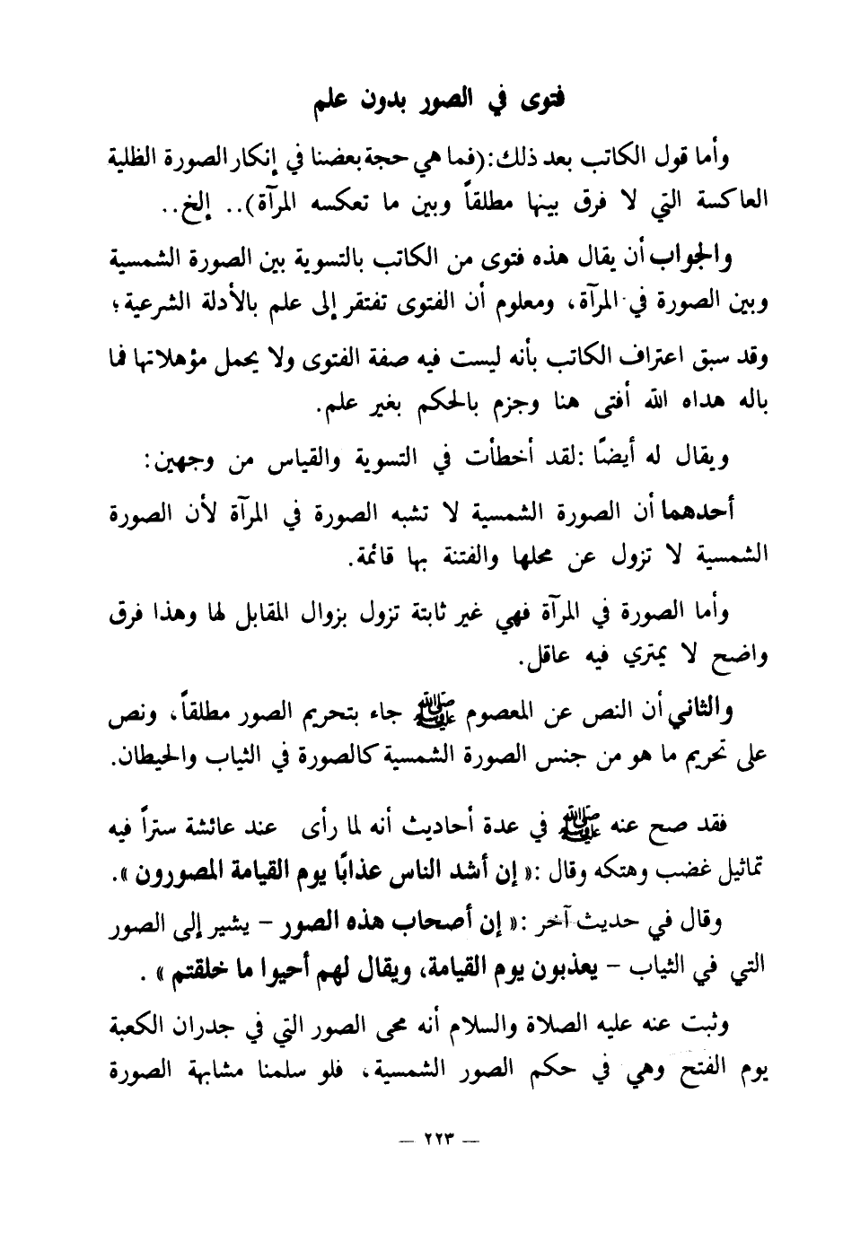 والجواب أن يقال هذه فتوى من الكاتب بالتسوية بين الصورة الشمسية وبين الصورة في المرآة، ومعلوم أن الفتوى تفتقر إلى علم بالأدلة الشرعية؛ وقد سبق اعتراف الكاتب بأنه ليست فيه صفة الفتوى ولا يحمل مؤهلاتها فما باله هداه الله أفتى هنا وجزم بالحكم بغير علم.